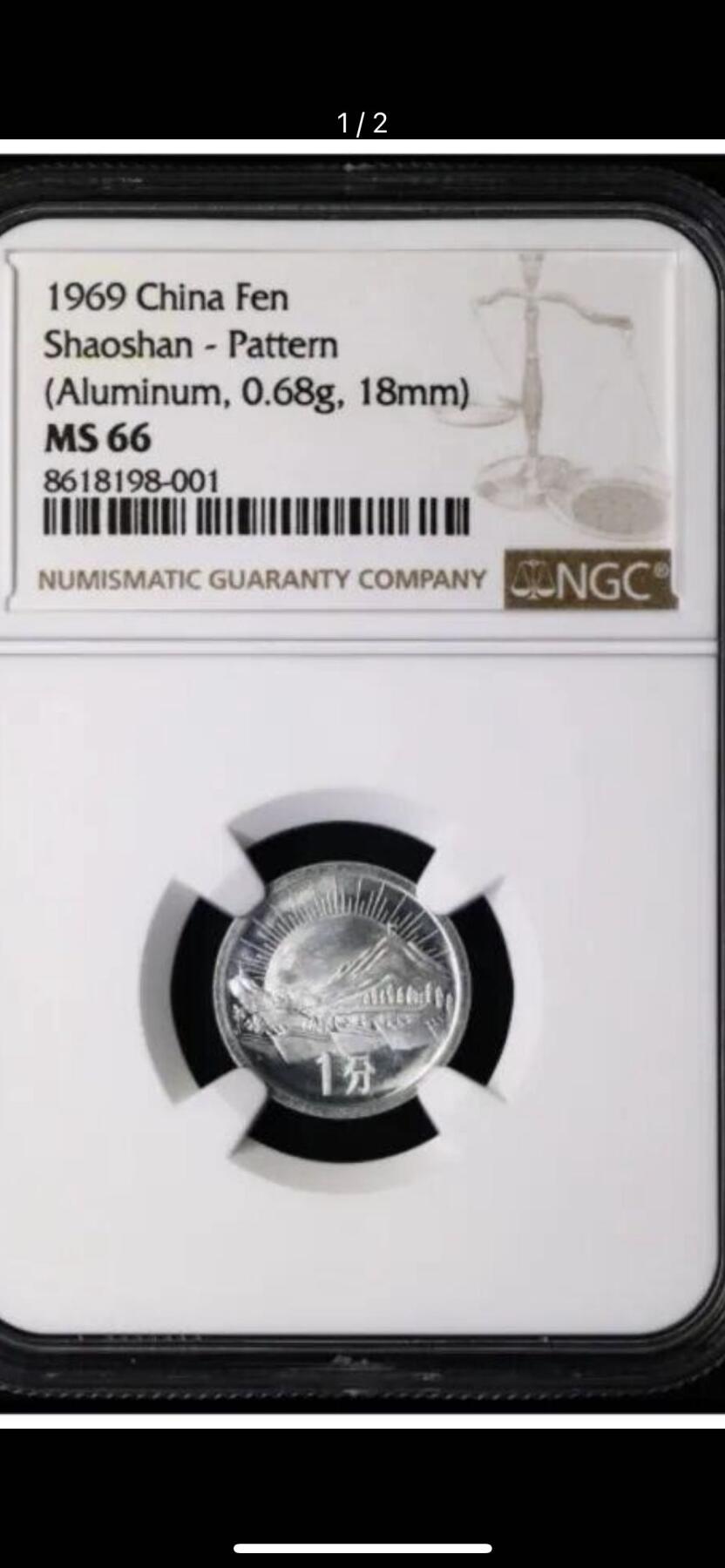 1969年韶山1分,属于革命圣地试铸币,铝合金材质,未发行。 正面图案为国徽,上国号,下年号; 背面为中心图案为韶山,远景为红太阳放光芒图案。 该试样币设计主体明确,时代气息鲜明,那段特殊岁月痕迹从钱币图案扑面而来,是极为珍贵的货币铸造实物史料。