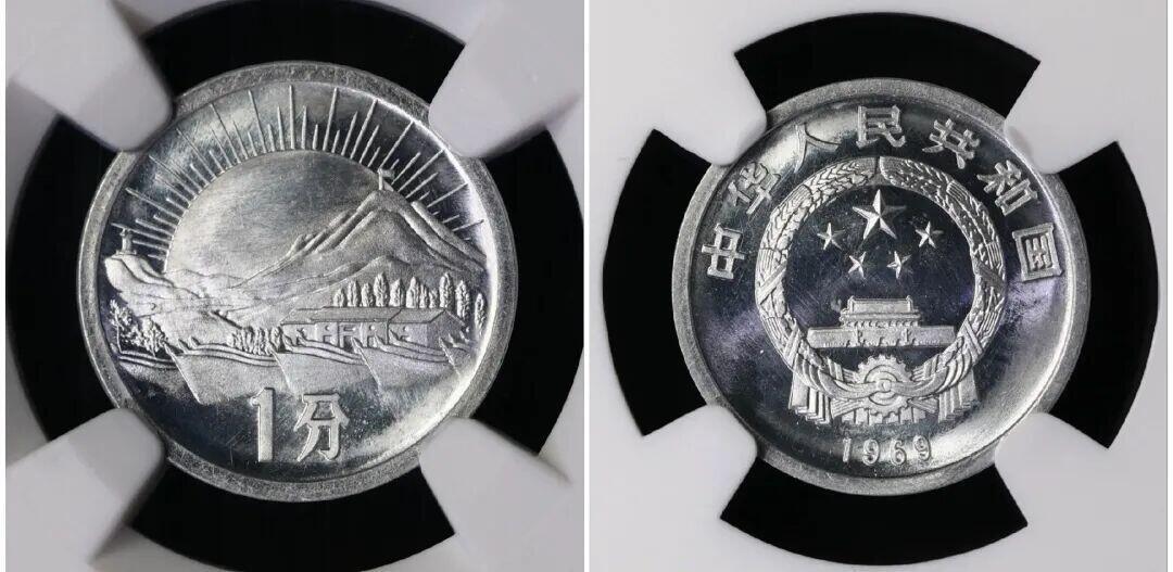 1969年韶山1分,属于革命圣地试铸币,铝合金材质,未发行。 正面图案为国徽,上国号,下年号; 背面为中心图案为韶山,远景为红太阳放光芒图案。 该试样币设计主体明确,时代气息鲜明,那段特殊岁月痕迹从钱币图案扑面而来,是极为珍贵的货币铸造实物史料。