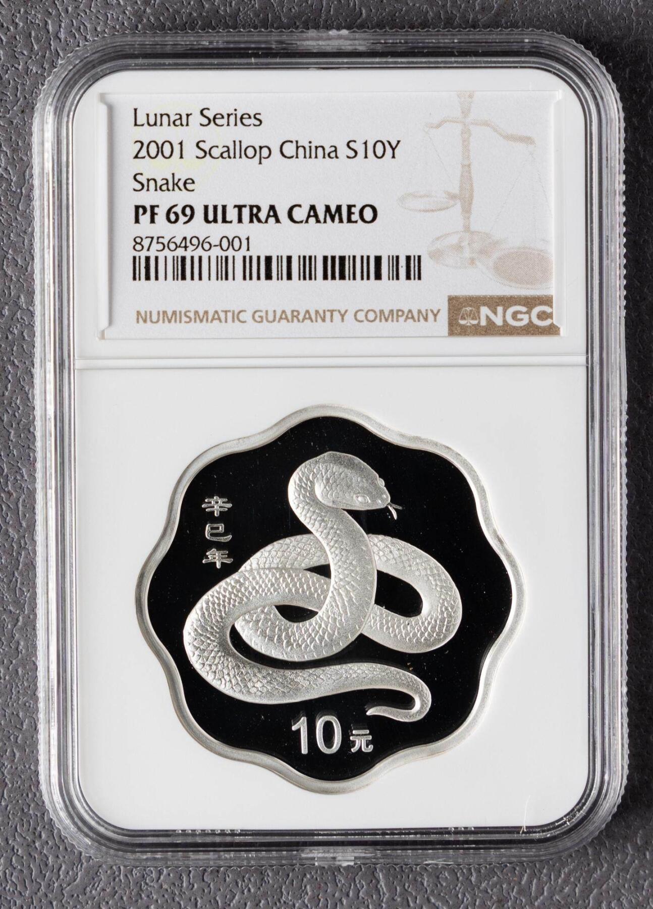 - 背面:主体为盘绕的写实灵蛇,鳞片纹理雕刻精细,细节还原度极高;左侧刊“辛巳年”干支纪年,下方刊“10元”面额,黑底镜面衬托下浮雕立体感拉满。