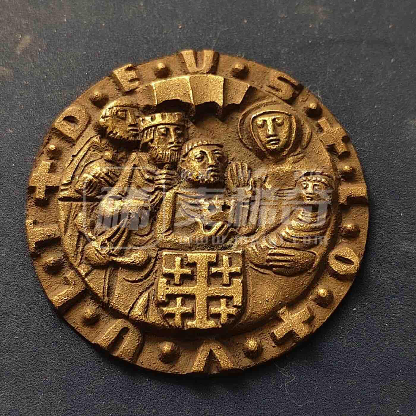 耶路撒冷十字宗教纪念章,黄铜浇铸工艺,正面为东方三博士朝圣场景,中心饰耶路撒冷十字,边缘环绕拉丁文“DEUS +OTTO”,背面素面带挂孔,具中世纪神圣罗马帝国与十字军文化风格。
