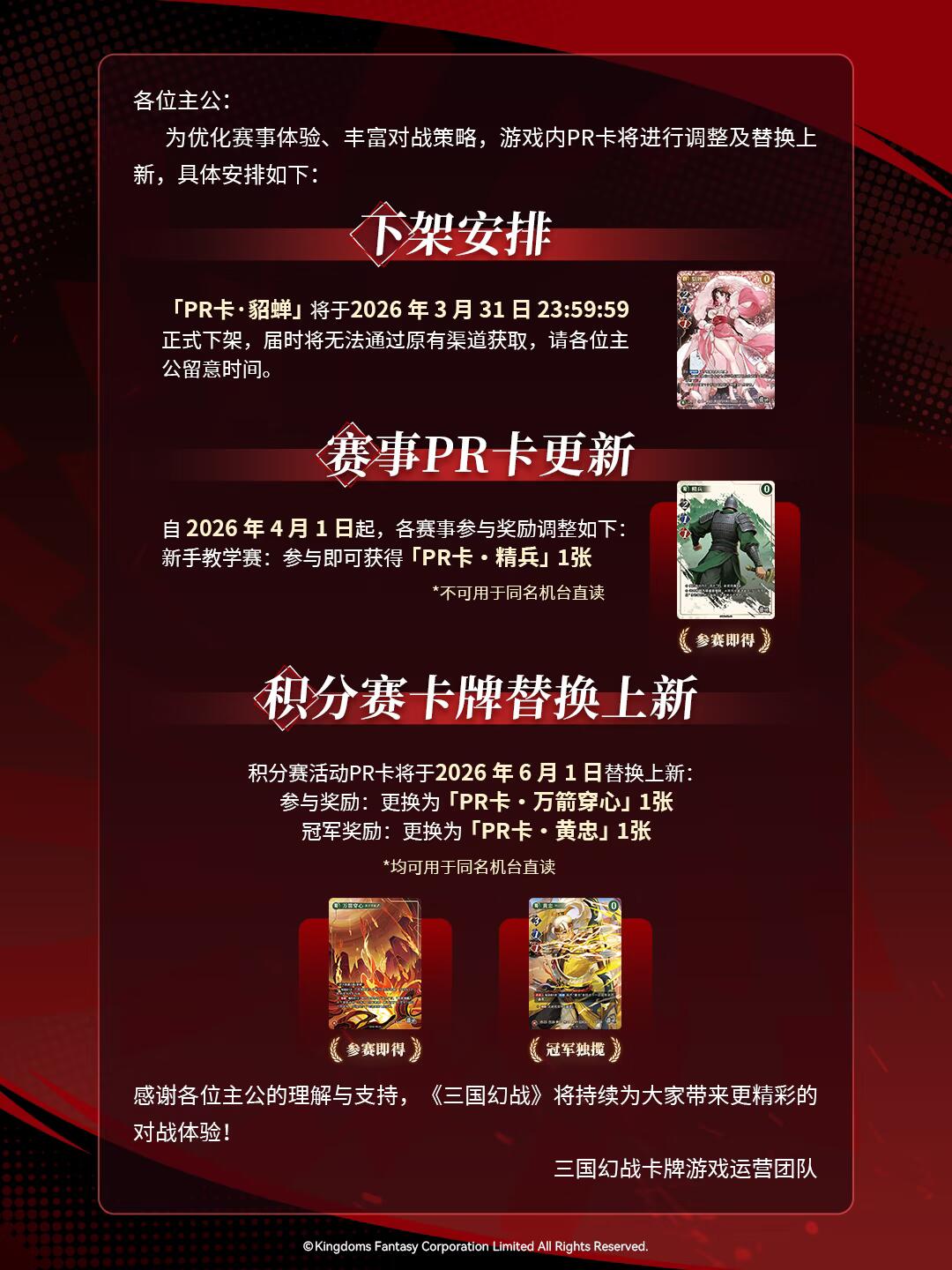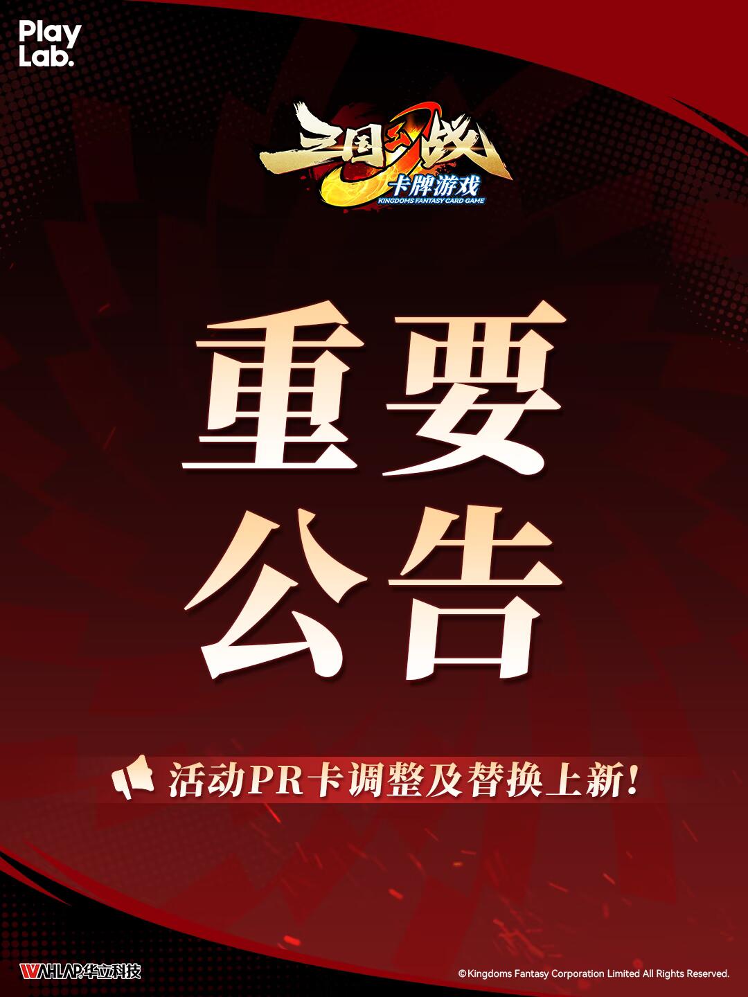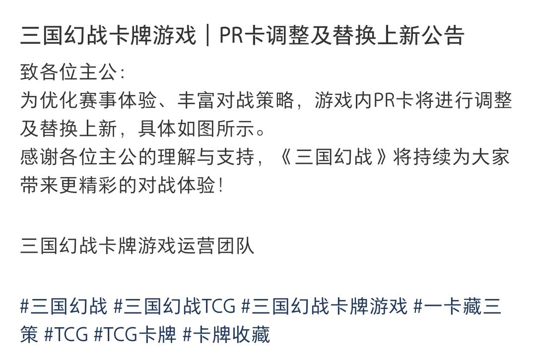 三国幻战卡牌游戏|PR卡调整及替换上新公告 致各位主公: 为优化赛事体验、丰富对战策略,游戏内PR卡将进行调整及替换上新,具体如图所示。 感谢各位主公的理解与支持,《三国幻战》将持续为大家带来更精彩的对战体验! 三国幻战卡牌游戏运营团队 #三国幻战 #三国幻战TCG #三国幻战卡牌游戏 #一卡藏三策 #TCG #TCG卡牌 #卡牌收藏