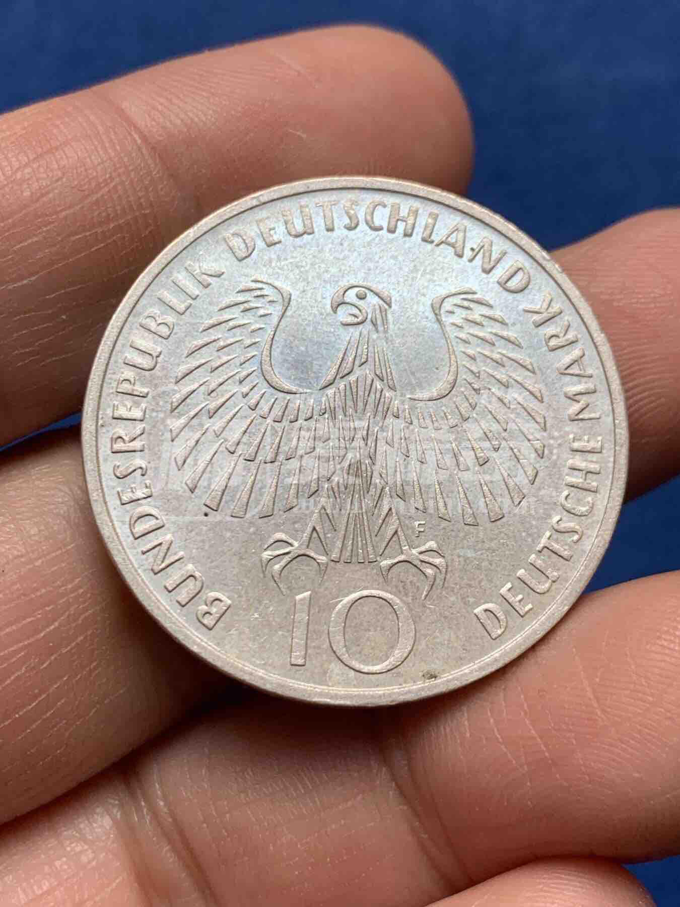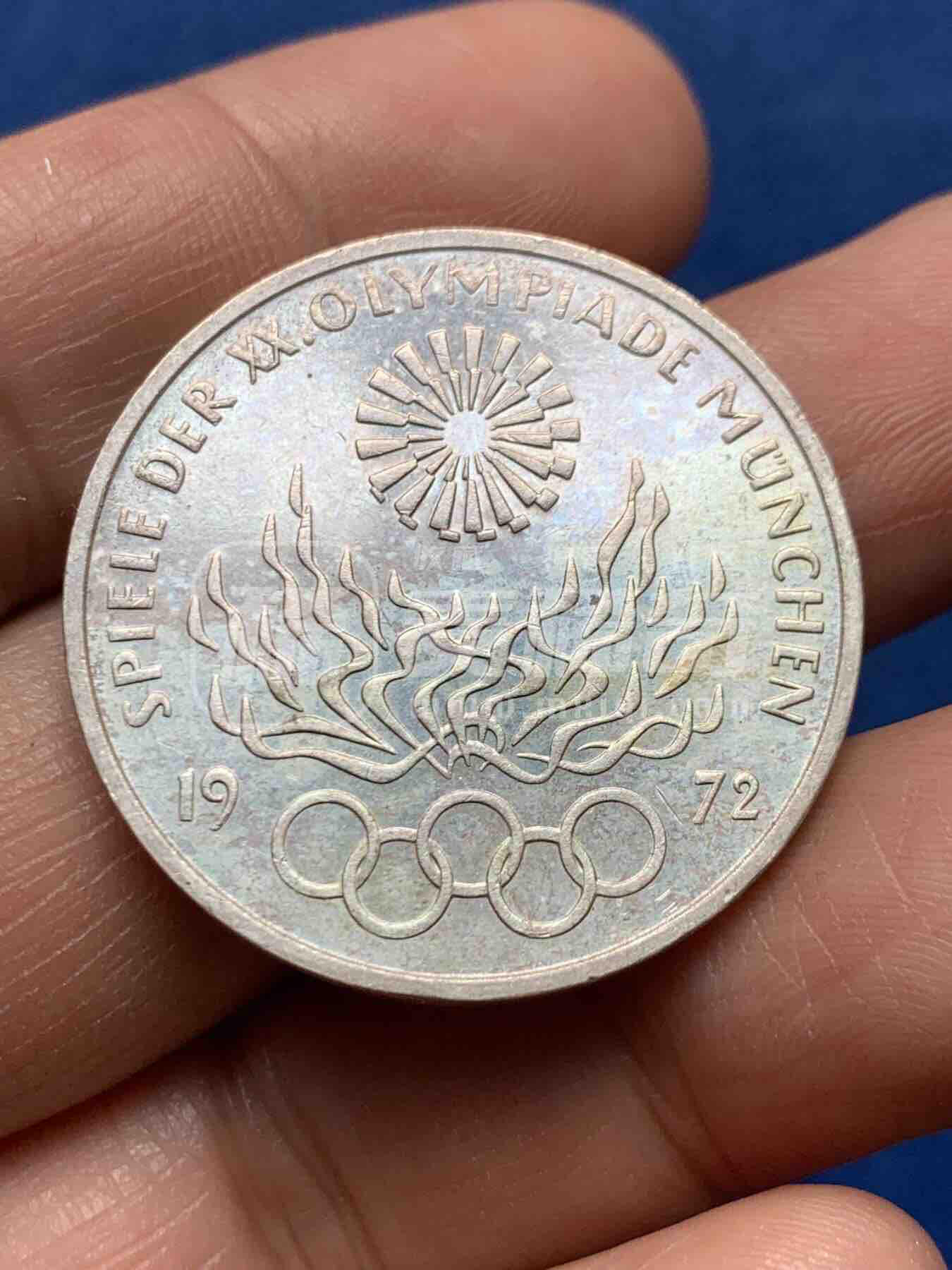 1972年联邦德国发行的慕尼黑第20届夏季奥运会10马克纪念银币,F厂(斯图加特造币厂)版,含银62.5%,正面为联邦鹰徽,背面刻奥运圣火、五环与会徽,边铭“更快、更高、更强”。