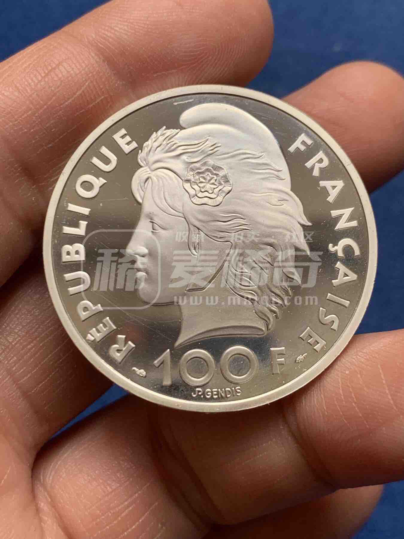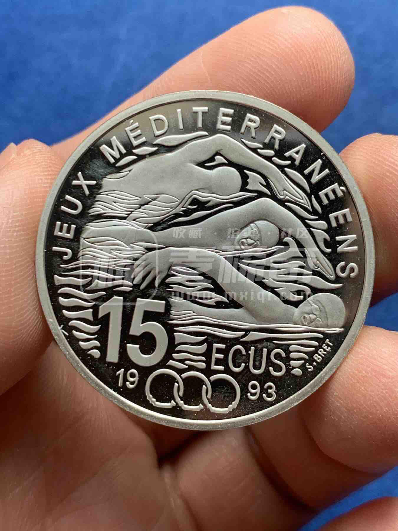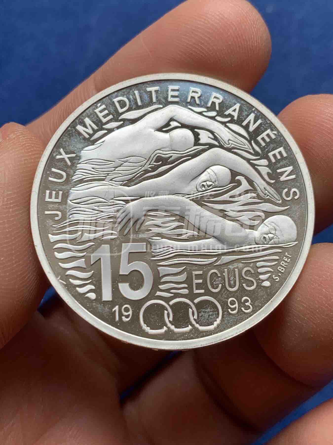 法国1993年发行的地中海运动会100法郎(15埃居)精制纪念银币,正面为玛丽安娜女神像,背面刻游泳运动员、奥运五环,银质,纪念该届在地中海地区举办的综合性赛事。