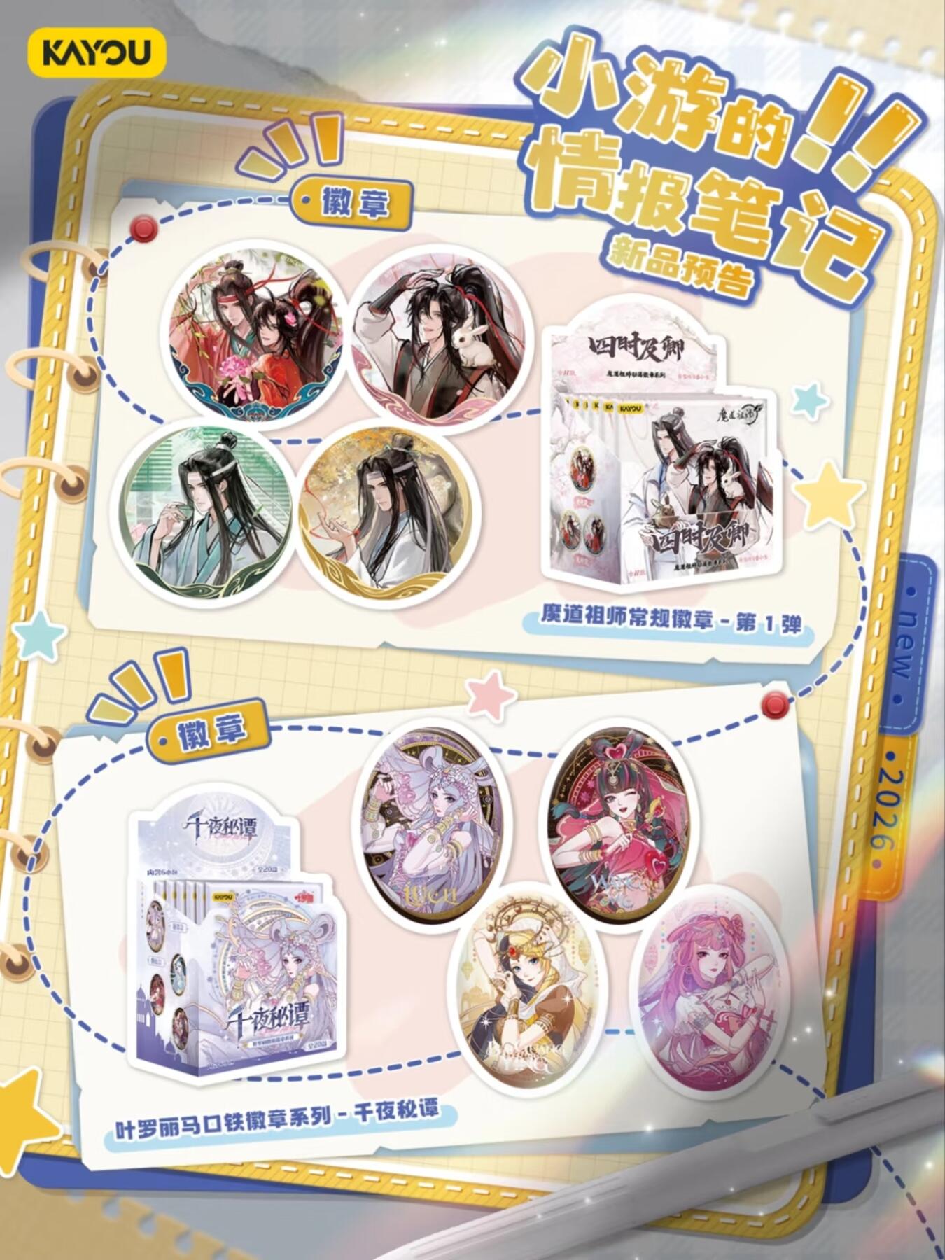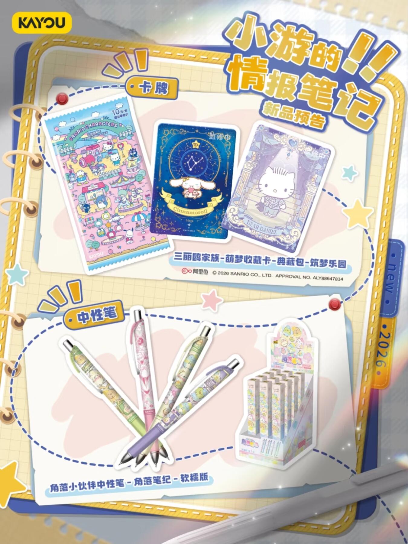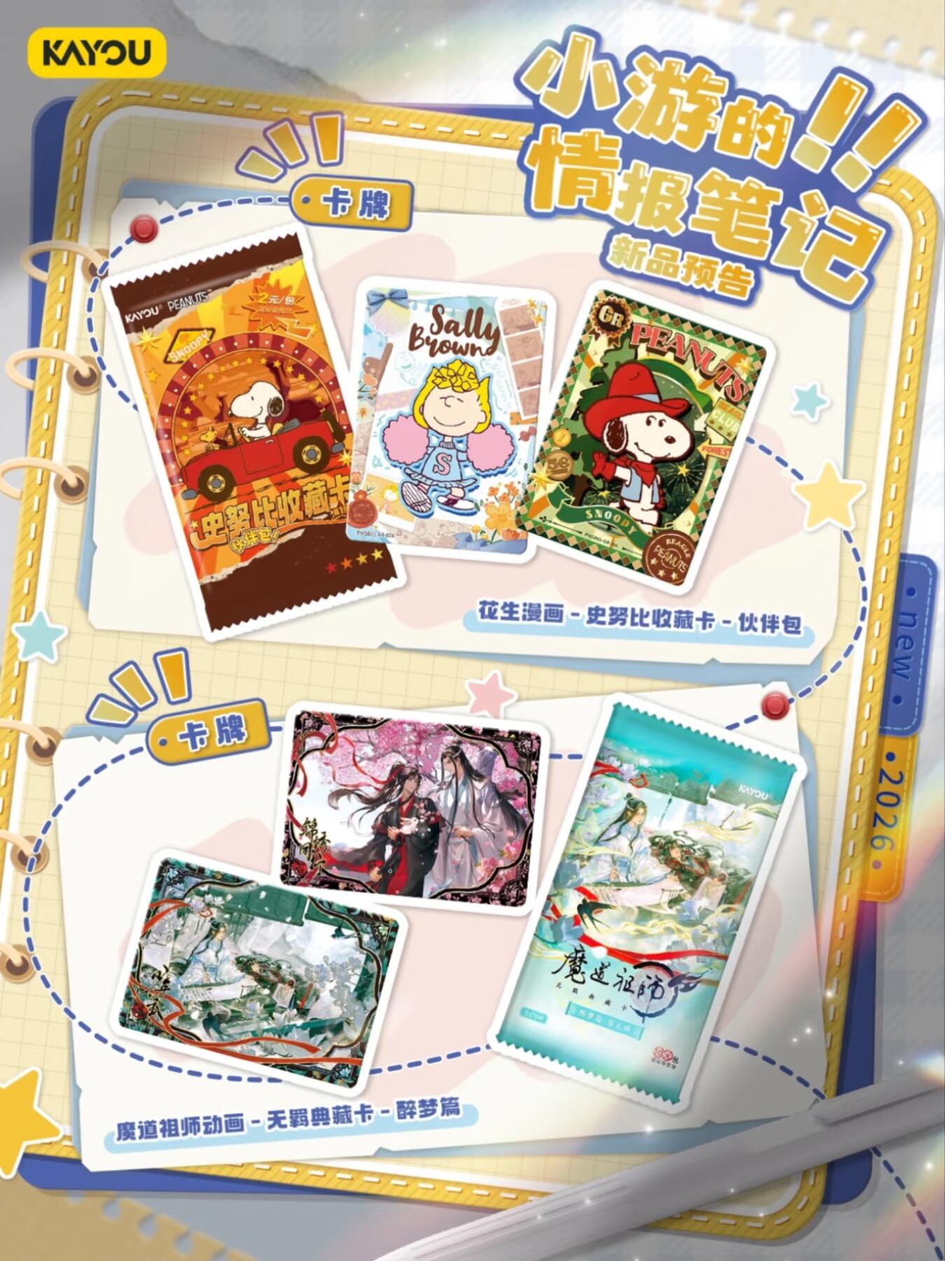 卡游近期新品预告 解锁更多情报 卡游近期新品预告来啦,史努比、魔道祖师动画、三丽鸥家族卡牌系列即将焕新登场,多款独家新绘卡面等你解锁。 全新官宣合作IP角落小伙伴 首发角落小伙伴中性笔,清新的颜色伴你学习生活~ 魔道祖师常规徽章、叶罗丽马口铁徽章系列精选角色精美形象,在徽章工艺加持之下更显闪耀华美。 还有更多神秘新品亟待揭晓,敬请期待!