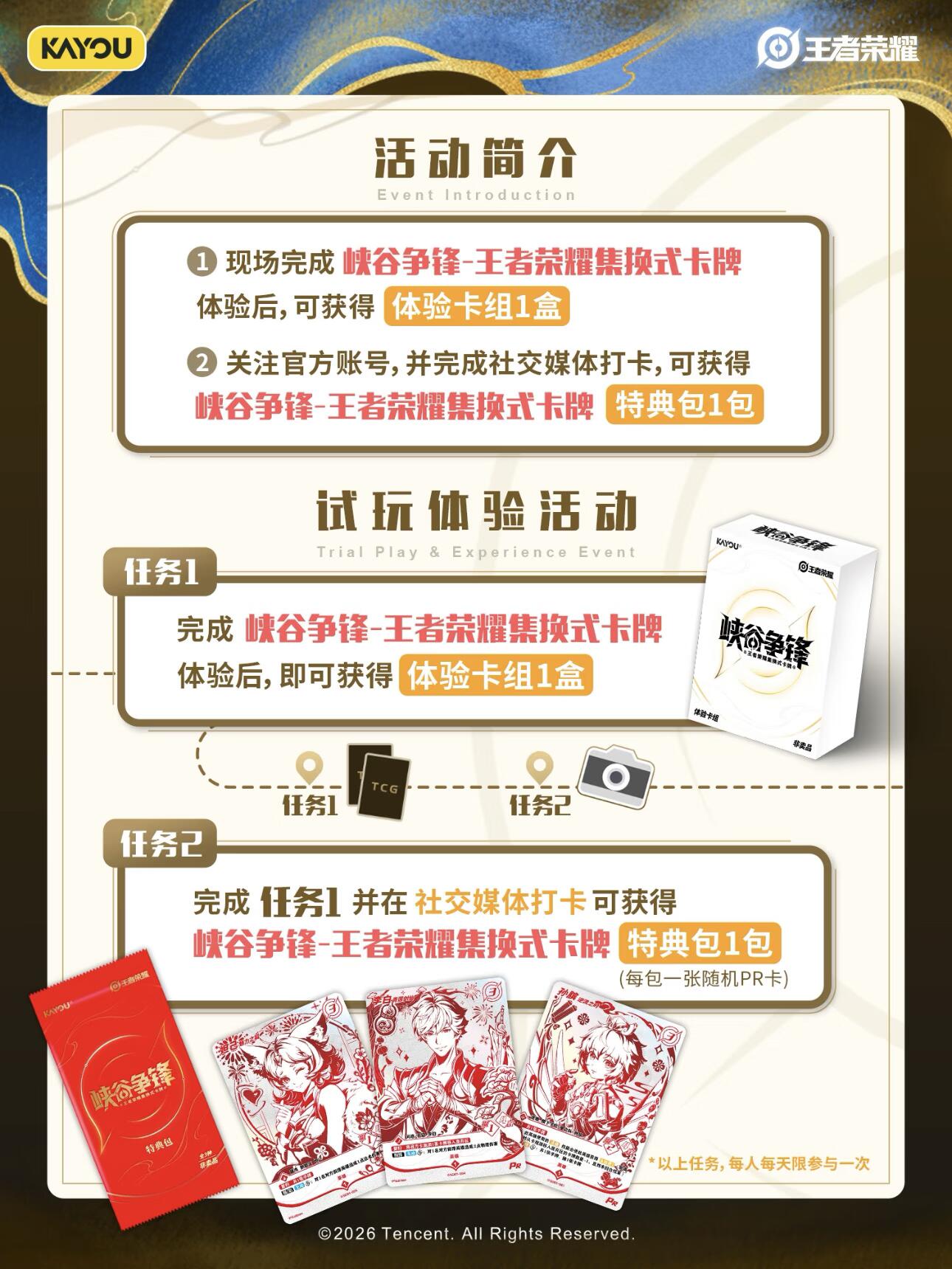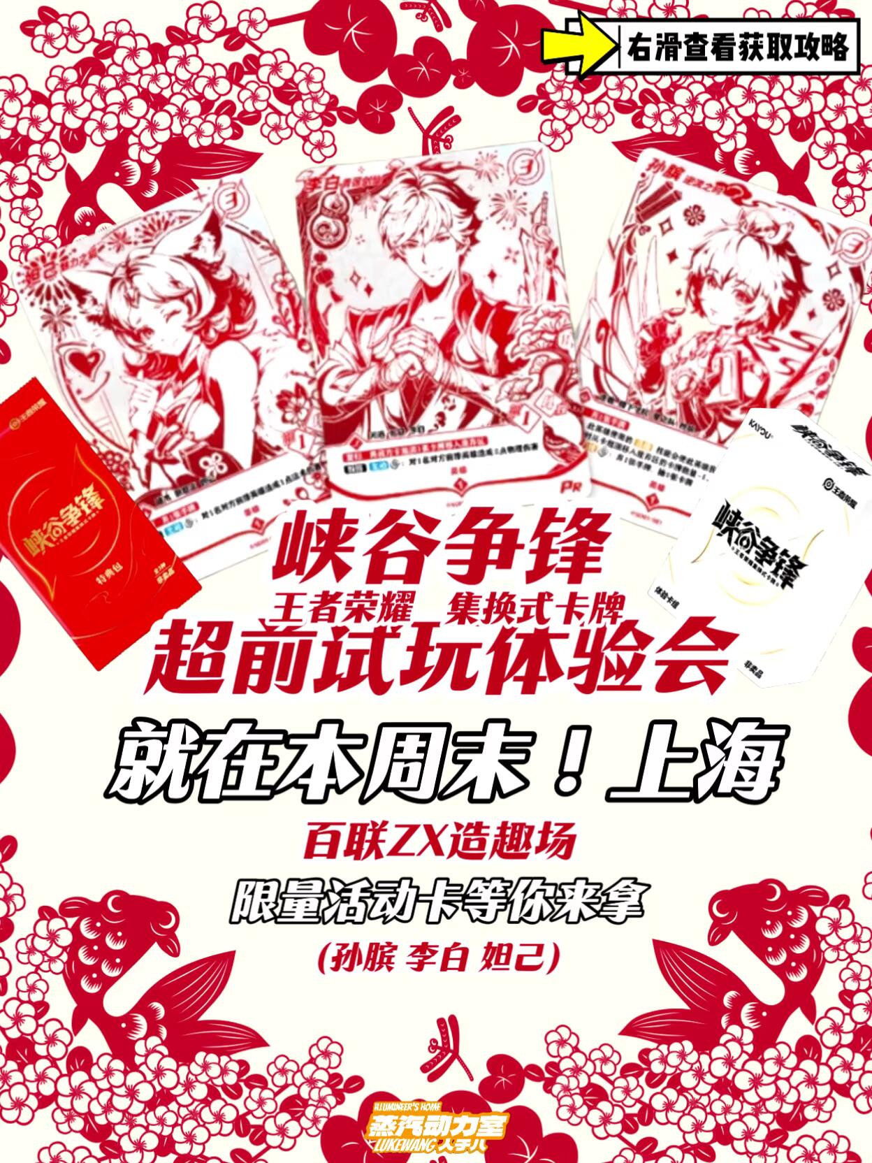 【峡谷争锋】超前试玩限量活动卡攻略🧧 ♦️峡谷争锋-王者荣耀集换式卡牌 超前试玩体验会来袭 ⏰活动预约开启时间:3.31日 现场活动时间:4.3日-5.5日 🏢活动地点:百联ZX造趣场 (上海)L1 💥活动亮点: 🎮抢先试玩游戏内容 🧧三款限量活动卡领取 🃏试玩卡组带回家