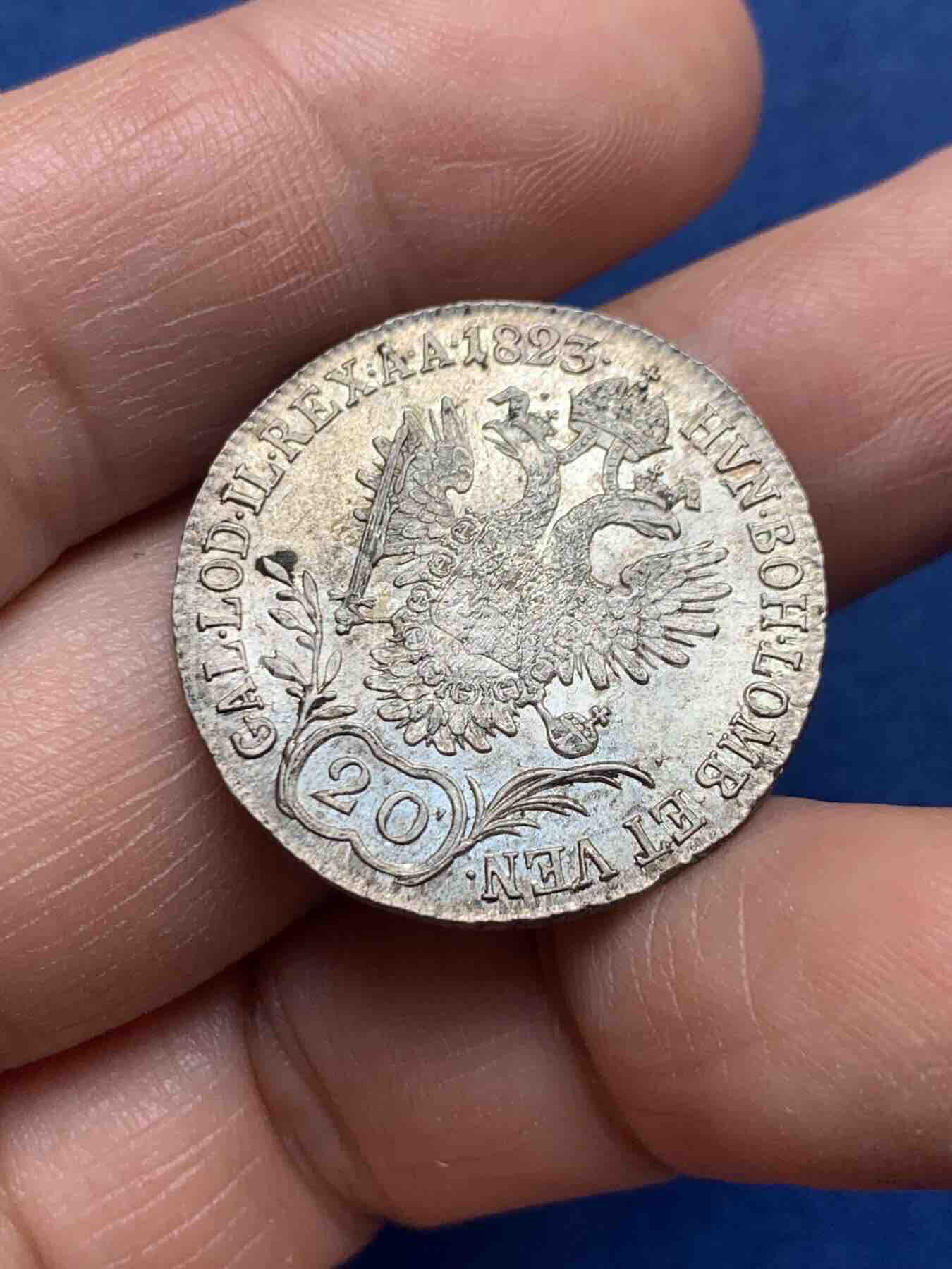 1823年奥地利帝国弗朗茨一世20克鲁泽银币,维也纳A厂铸造,正面为弗朗茨一世桂冠头像,背面是双头鹰纹章,19世纪奥匈帝国流通银币。