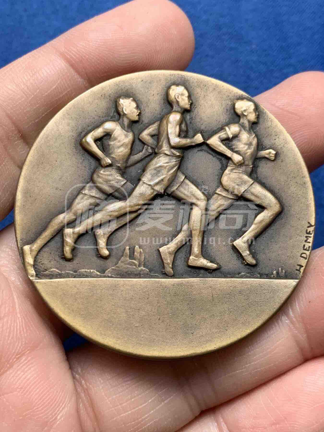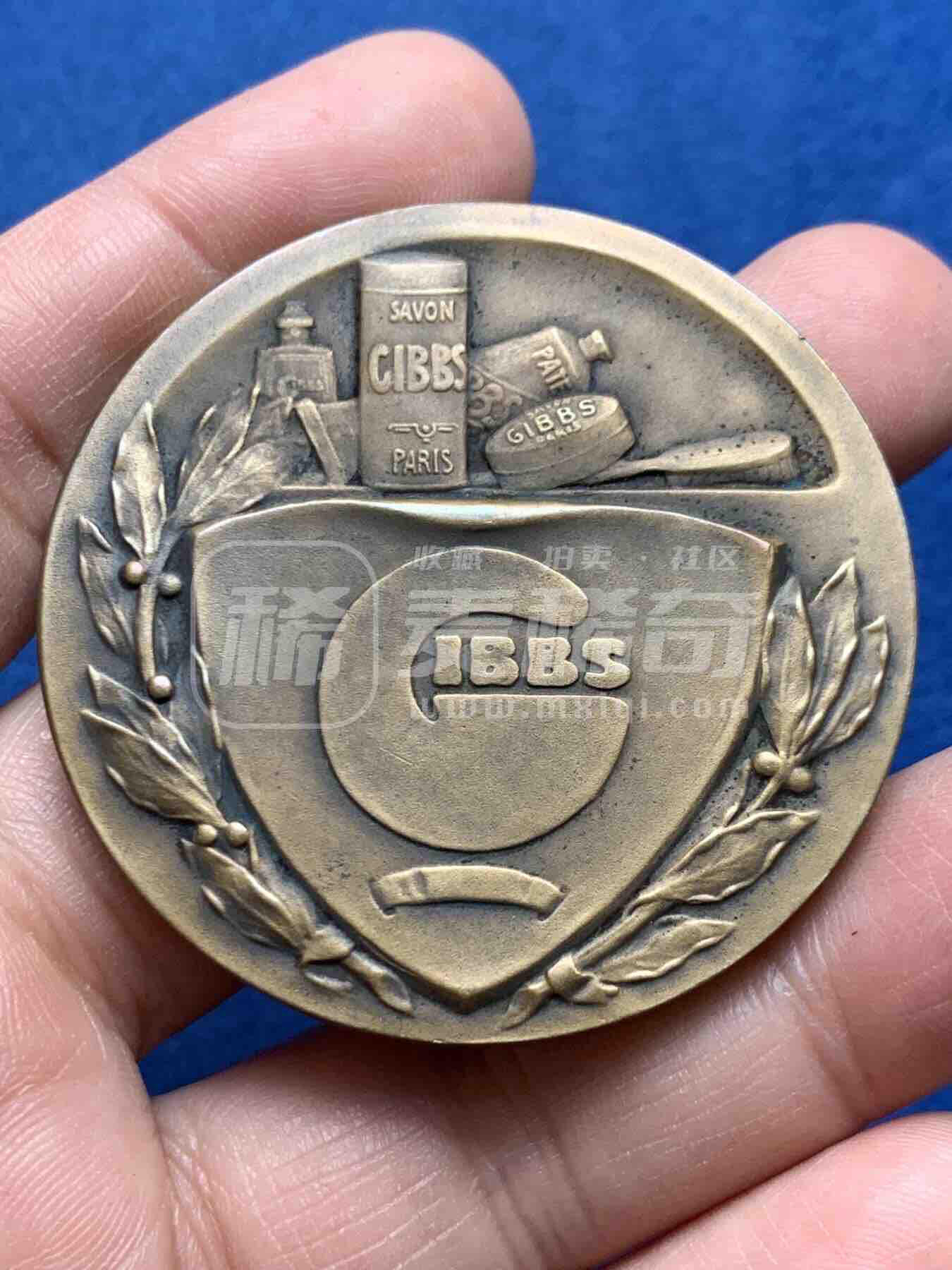 比利时雕刻家H.德梅设计的跑步主题铜章,正面以动感浮雕刻画三名奔跑者,线条充满力量感;背面为巴黎吉布斯(GIBBS)香皂品牌广告,盾形logo与皂品造型结合,是兼具运动纪念与商业广告属性的艺术铜章。
