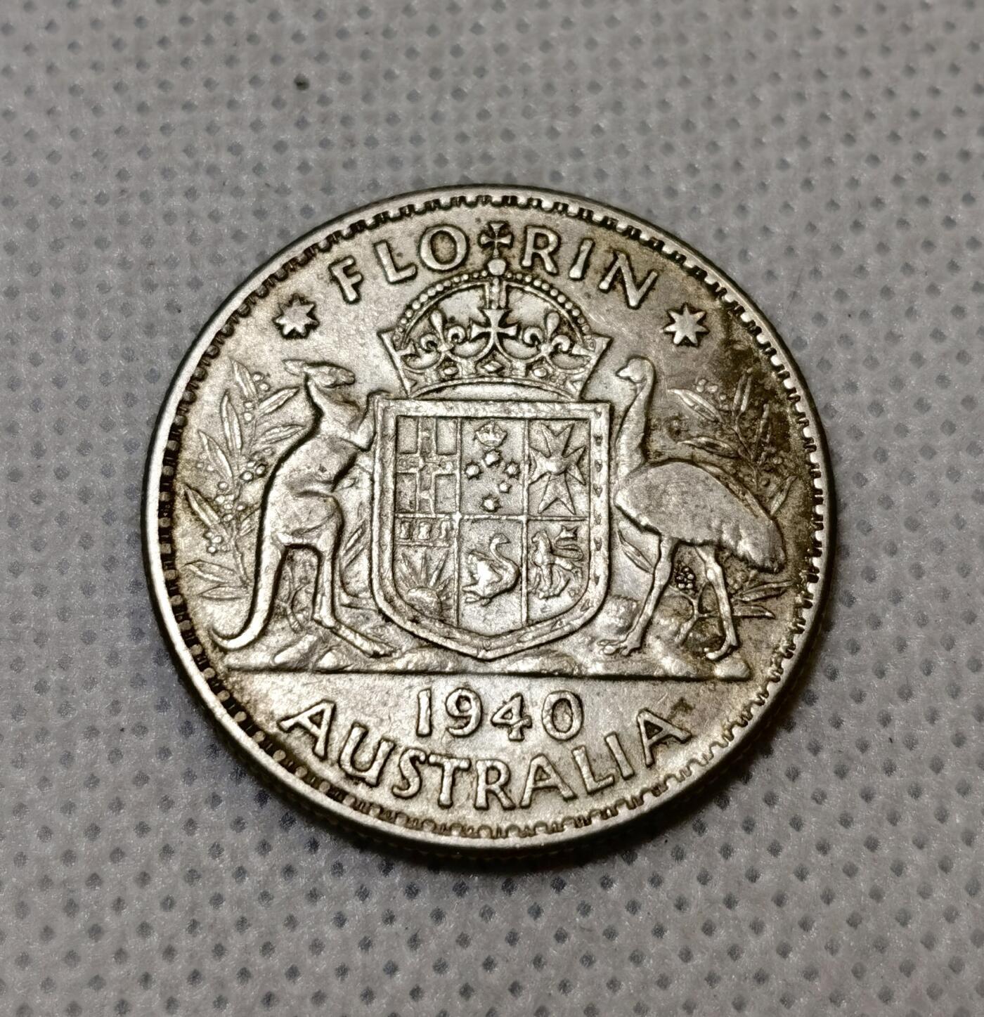 - 背面(第二图):澳大利亚联邦盾徽,左侧为袋鼠、右侧为鸸鹋(澳大利亚国兽),盾徽上方为圣爱德华王冠,两侧饰金合欢枝叶;上方标注面值 FLORIN (弗洛林,即2先令),下方标注年份 1940 与国名 AUSTRALIA 。