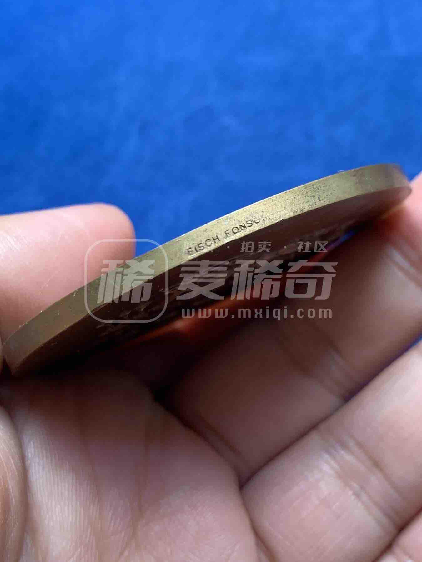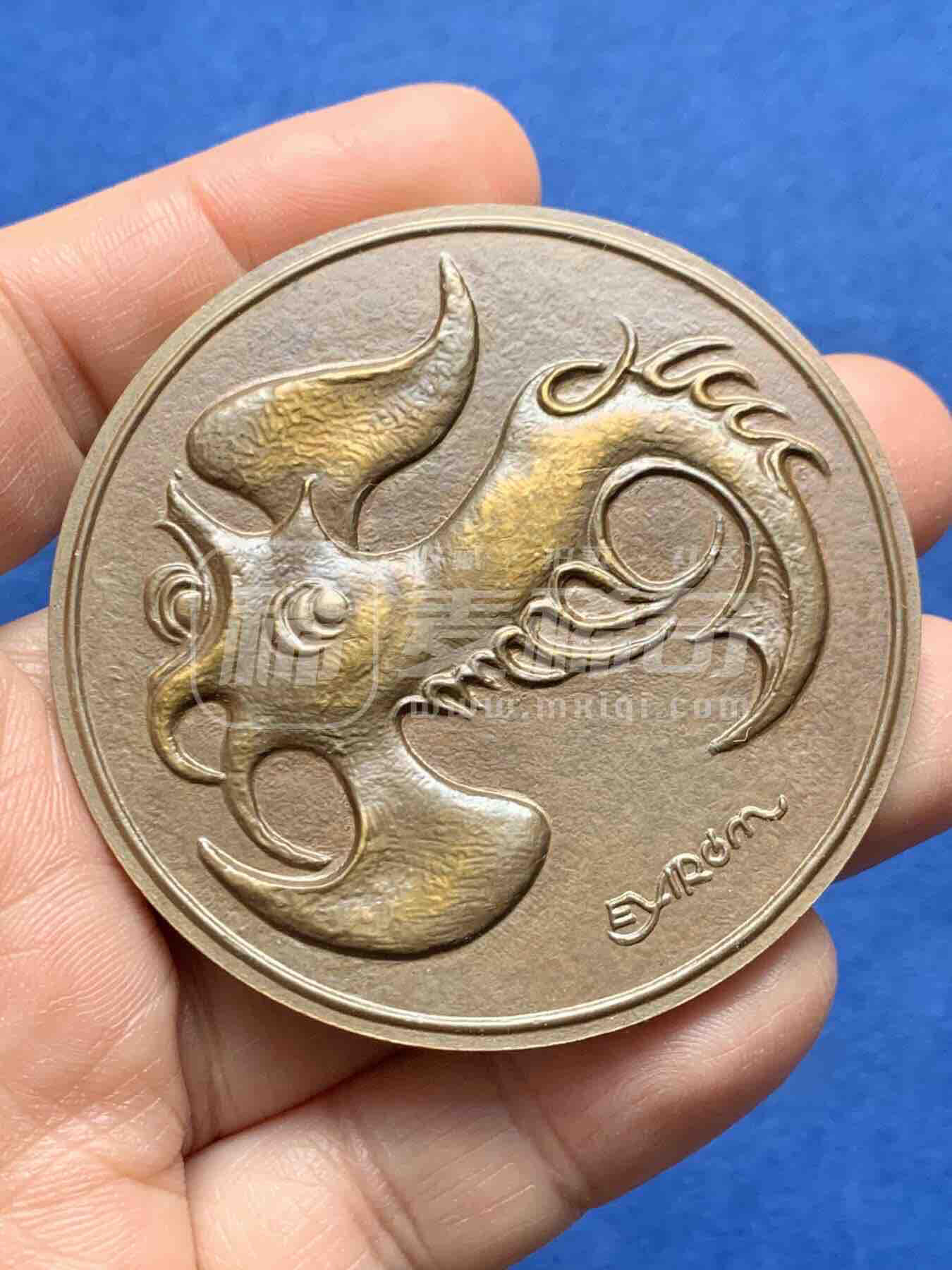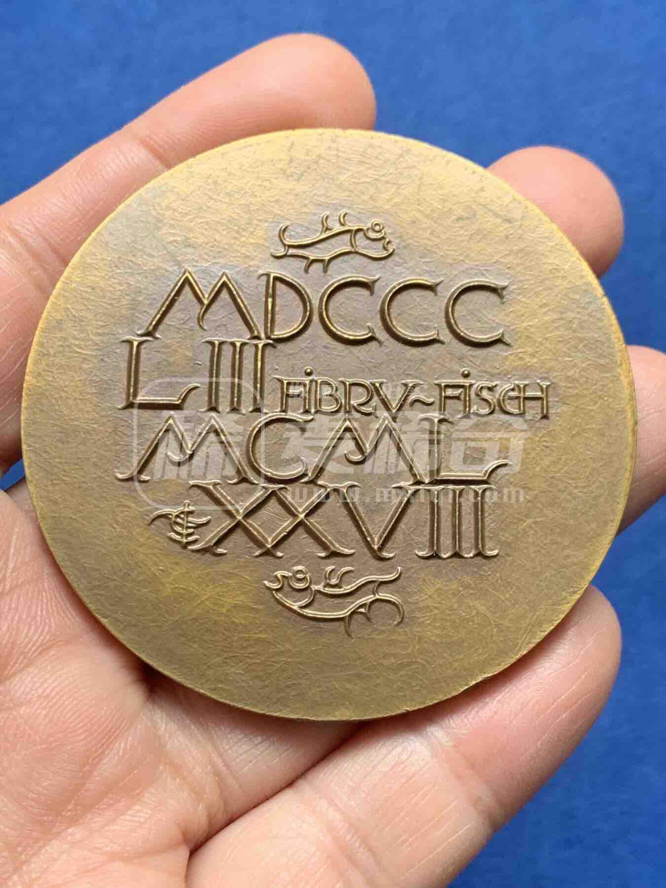 麦朵尔青铜艺术铜章。正面为北欧凯尔特风格抽象鱼形神兽,右下角署设计师签名。背面刻有“FIBRV-FISCH”(德语“鱼”)字样,上下点缀三枚风格化鱼形纹饰,工艺精湛,艺术价值突出。