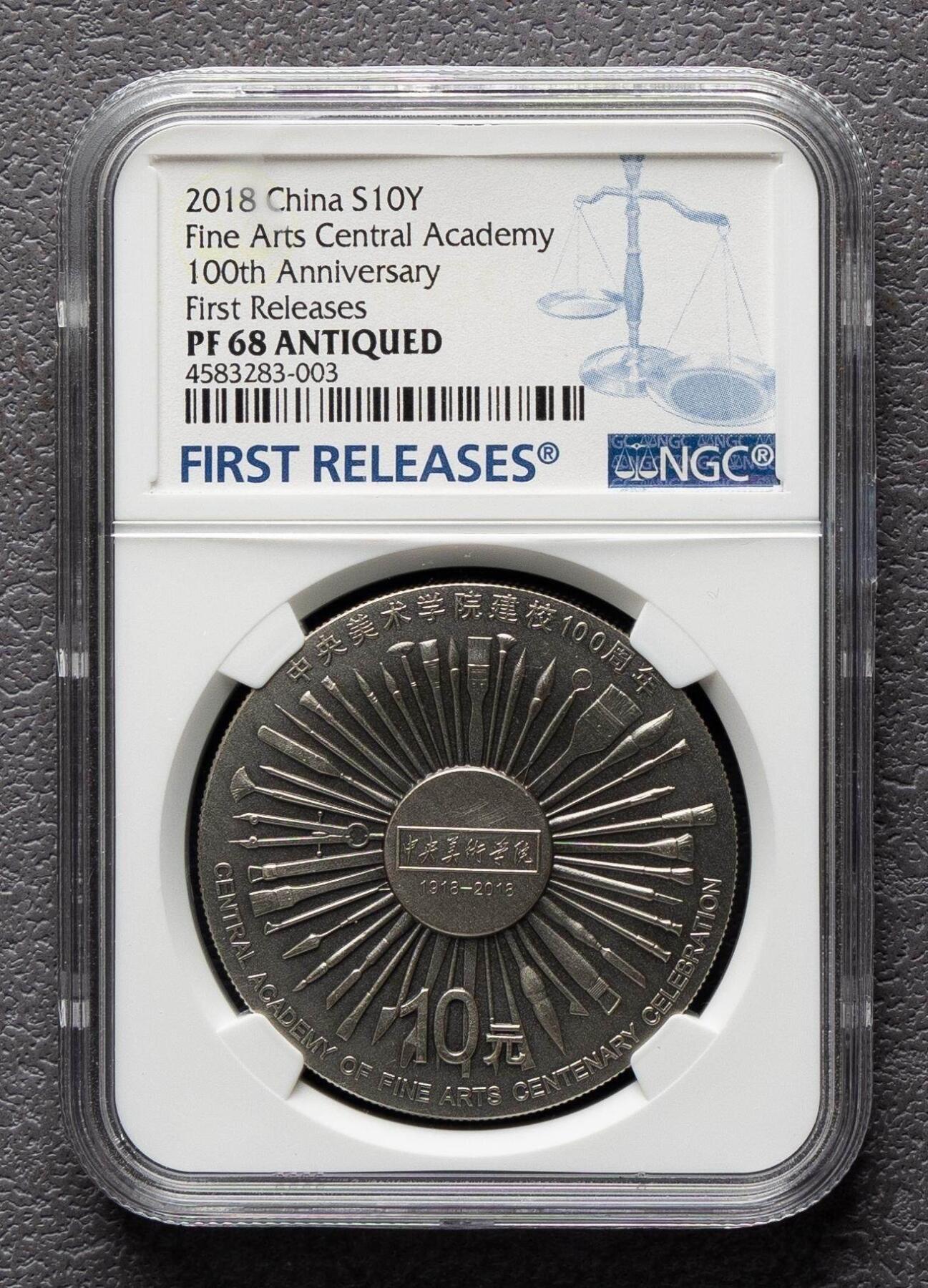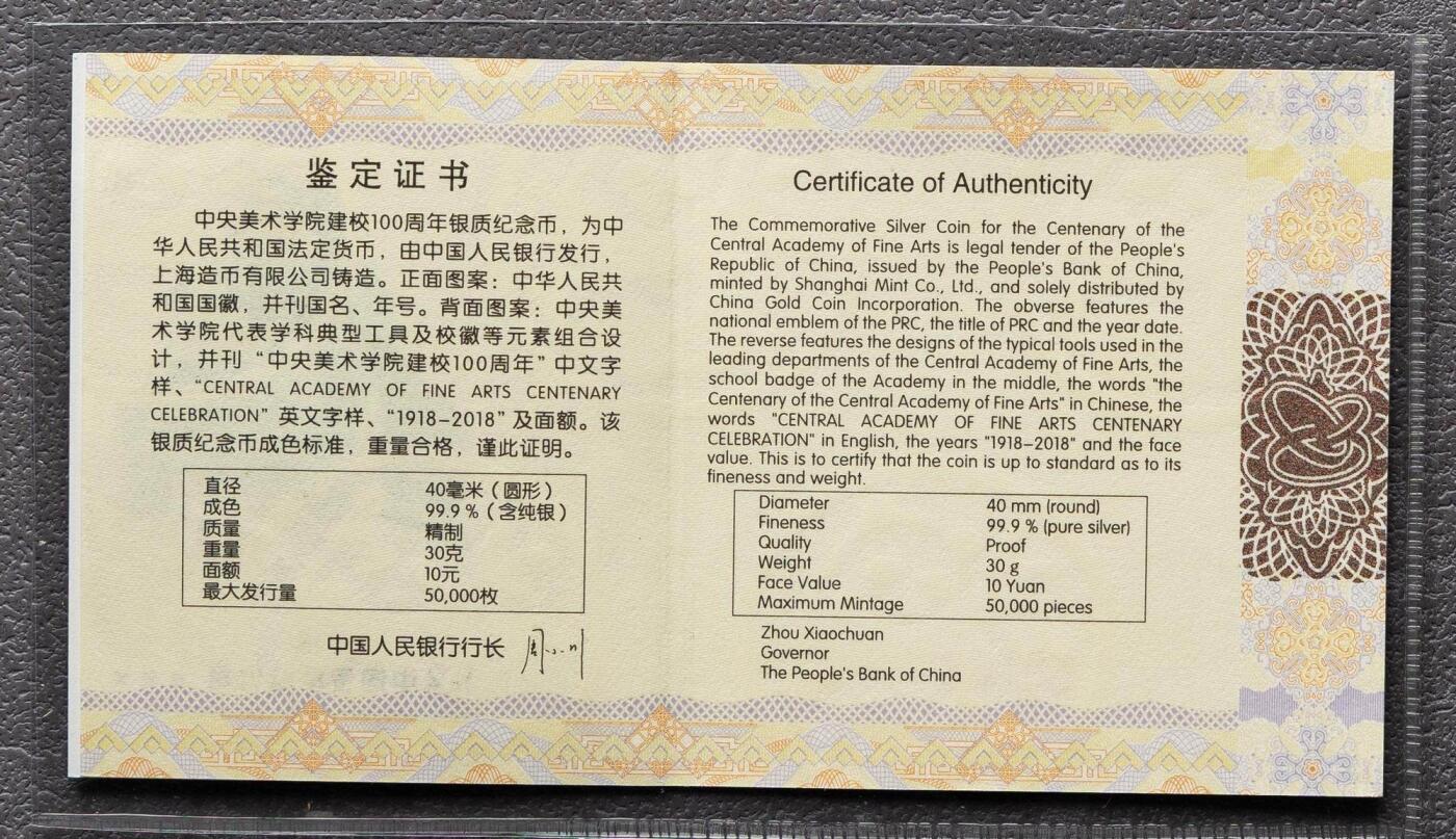 - 文字标注:环绕“中央美术学院建校100周年”“CENTRAL ACADEMY OF FINE ARTS CENTENARY CELEBRATION”,中心区域标注“中央美术学院 1918-2018”及面额“10元”