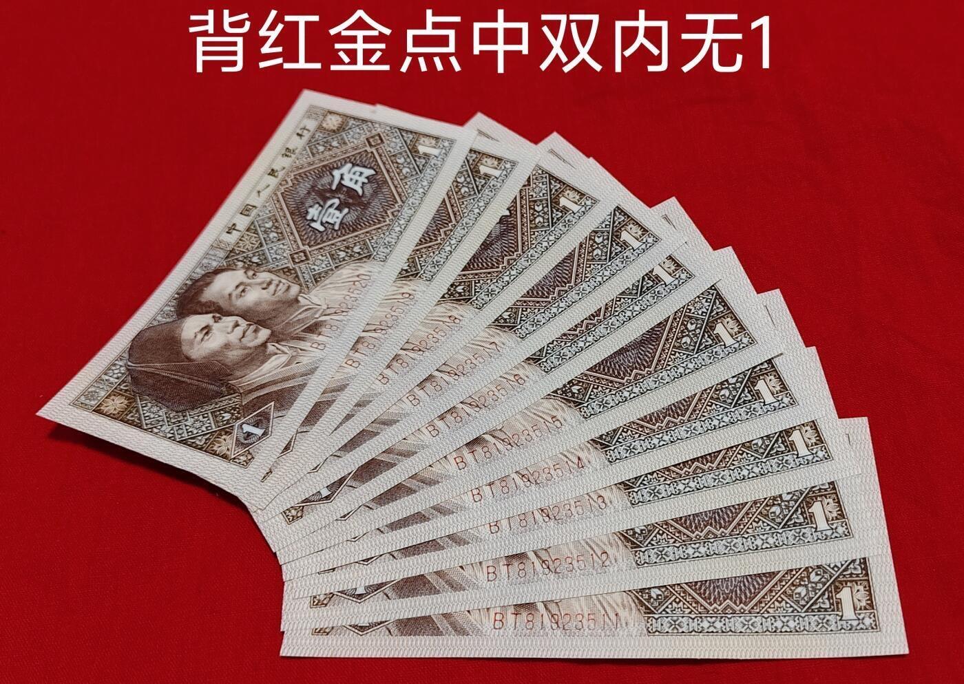 8001BT背红金点中双内无1终于发现了!双内无1错印壹角券是指纸币正面左侧小数字1和右侧大数字1在印刷过程中“同时”发生内框中的“1”部分缺失或是全部缺失而形成的错印体。金点中是指正面“中”字印刷变体。带金点中的双内无1存量更加稀少,还是发生在老冠背红题材上,属于双内无1的细分品种,堪称王中之王!10年前仅发现存量1000多张,然而经过近10年分散和消耗沉淀,如今市面上已经难得一见,散张都很难见到,更别说标准10连号了。早期背红+双内无1+金点中是压箱底珍品,具有很高的珍藏价值和市场价值,由于存量极度稀少,所以每张都显得那么珍稀,这么多年没有发现新的流水和货源。这组金点中双内无1背红外观完美品相、原生态捆拆绝品紫光灯下无斑,作为投资未来回报率极高!堪比收藏界的“金猴”和““背水”。