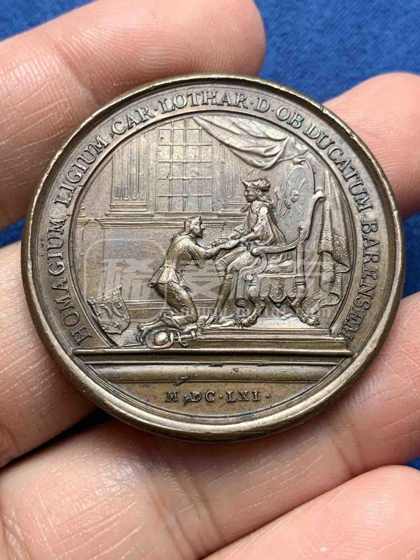 1661年法国路易十四时期铜章,由J.Mauger雕刻。正面为路易十四右侧胸像;背面刻画巴伦西亚公爵向路易十四行效忠礼场景,是法国王权强化的历史见证。