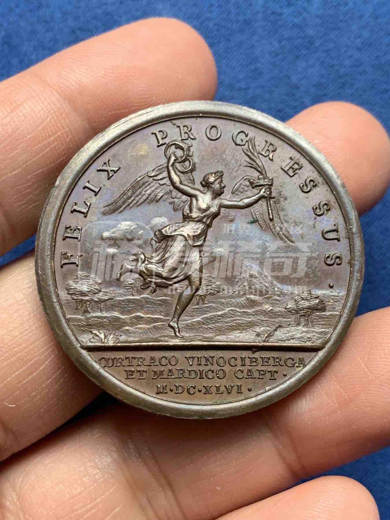 1646年法国路易十四时期铜章。正面为路易十四右侧胸像;背面为胜利女神,纪念法军攻占库尔特拉科等城。