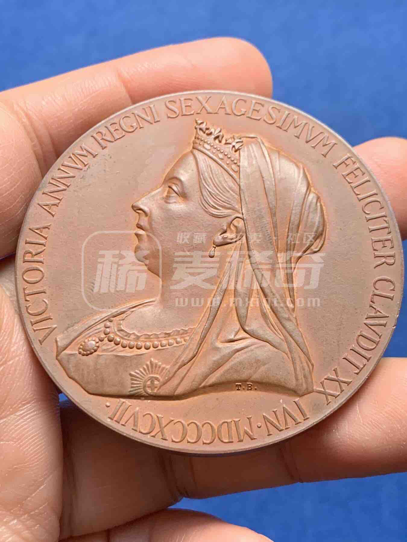 1897年英国维多利亚女王钻禧纪念铜章。正面为女王晚年戴冠胸像,镌登基60周年纪念铭文;背面为青年维多利亚像,配1837登基年份与拉丁文颂词。