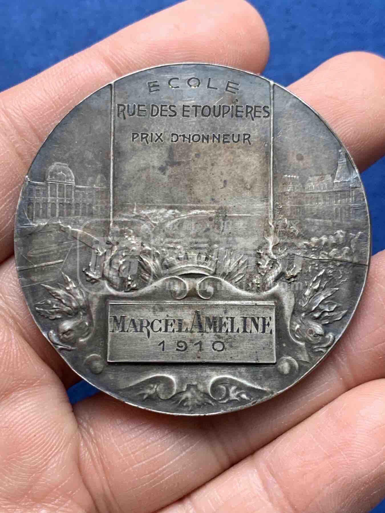 法国勒阿弗尔市1910年荣誉银质奖章,正面为飞翔的胜利女神,背景是勒阿弗尔港灯塔与航船,下方是市徽,刻“VILLE DU HAVRE”。背面标注学校、奖项名,刻获奖者名与年份。