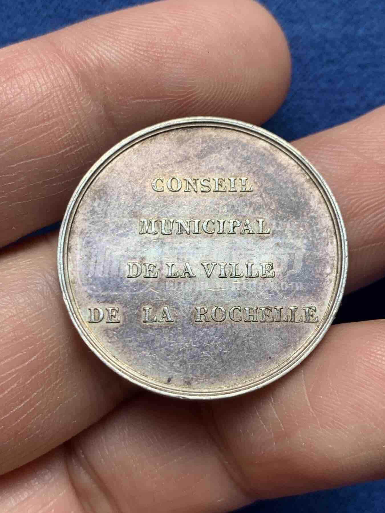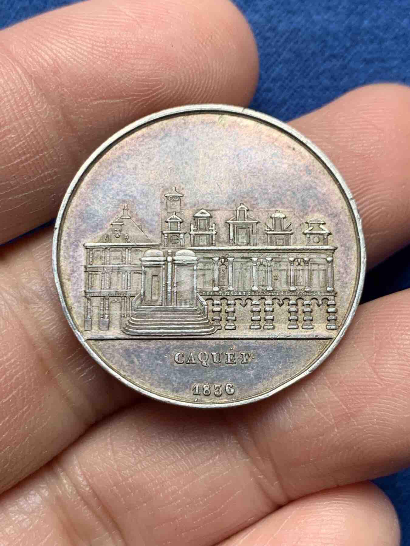 1836年法国拉罗谢尔市市政委员会银质纪念章,正面刻卡凯府建筑;背面铸“拉罗谢尔市市政委员会”法文,包浆温润,工艺精细。