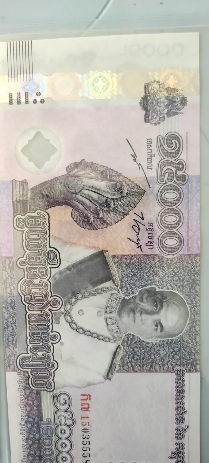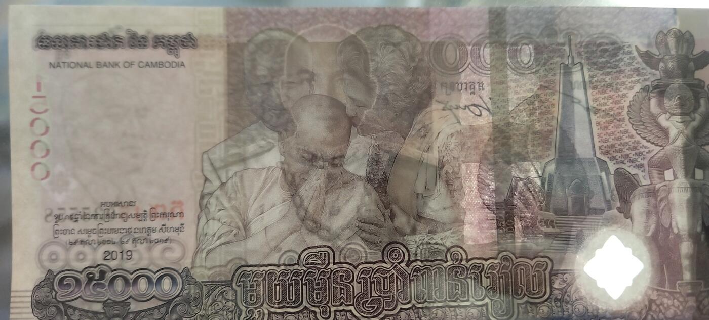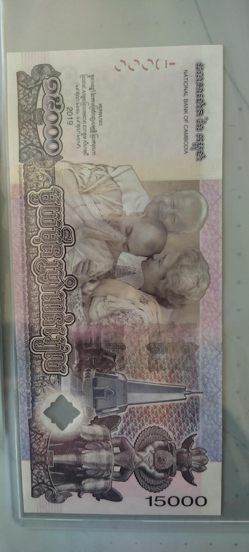 这张纪念钞于2019年发行正面:柬埔寨国王西哈莫尼肖像、柬埔寨吴哥窟前的7头那伽石像背面:西哈莫尼国王2004年在父母祝福下加冕情景、位于柬埔寨首都金边的双赢纪念碑、一座站在三头象身上、托着天鹅的迦楼罗石像