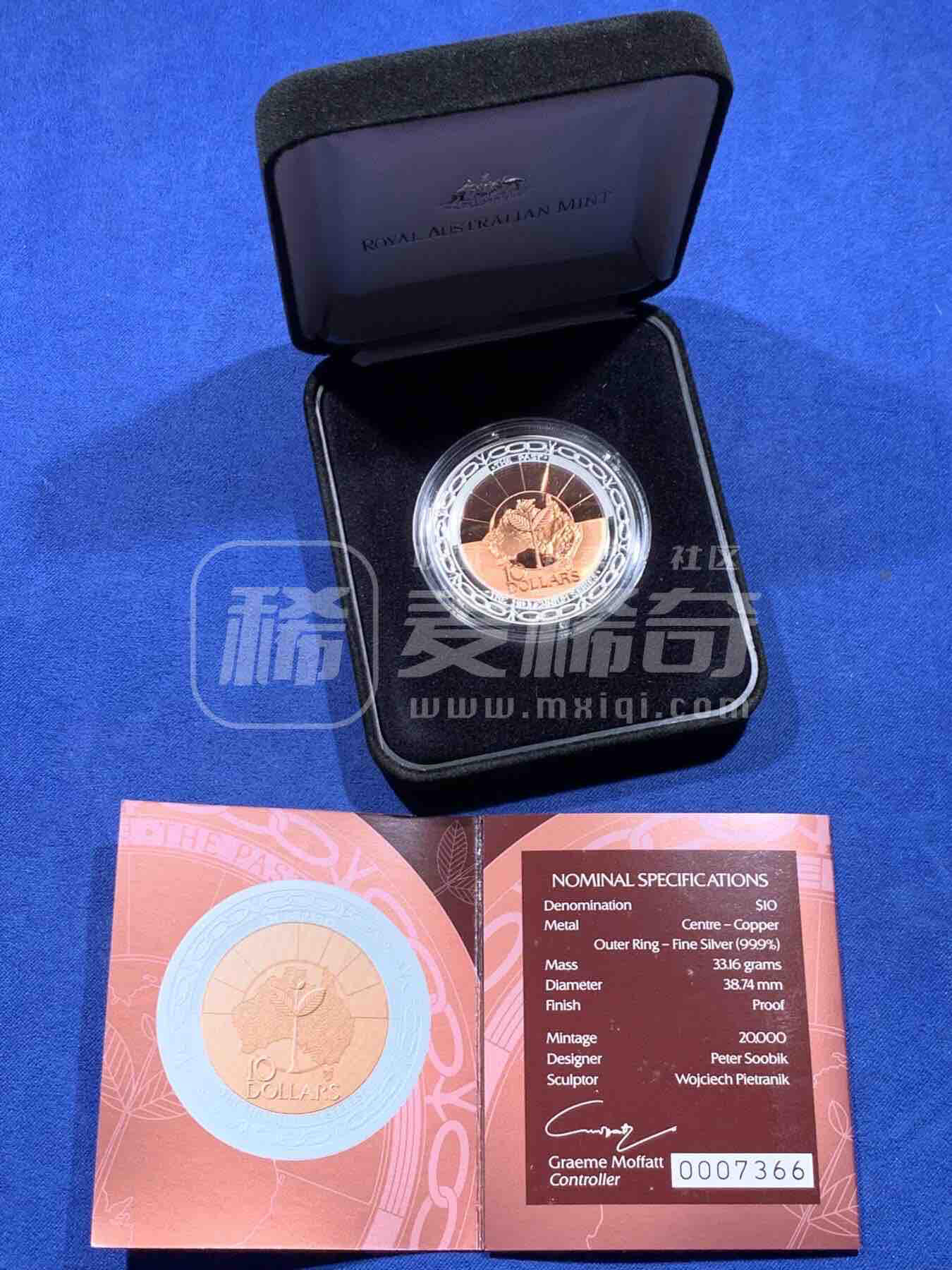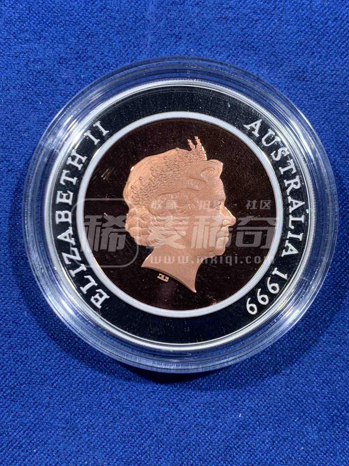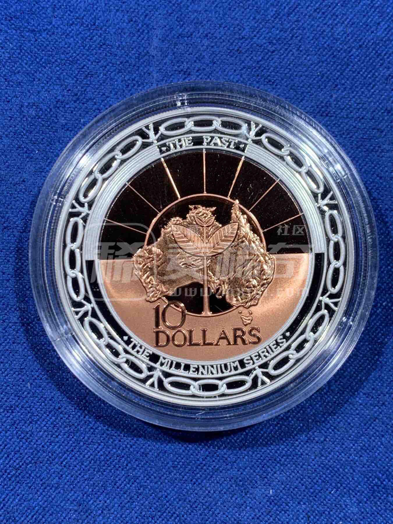 澳大利亚1999年发行的千禧年系列“过去”10澳元双金属精制纪念币,为该系列首枚。币面以铜芯象征澳洲历史文化,银环代表时间演进,背面为伊丽莎白二世侧像。