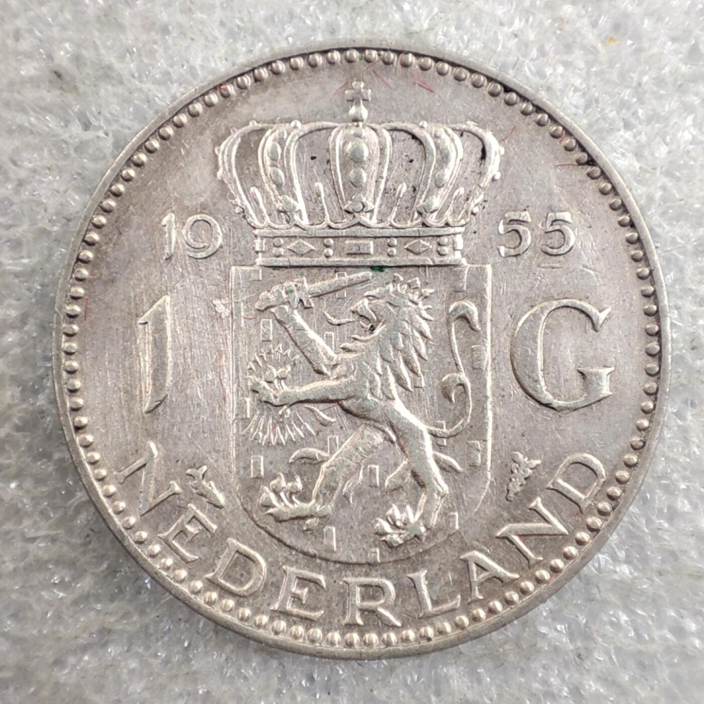 这是一枚荷兰王国1955年发行的1盾(1 Gulden)银币,两枚图分别展示了硬币的正反两面。