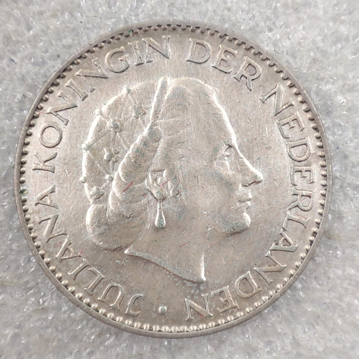 - 核心图案:荷兰女王**朱丽安娜(Juliana)**的右侧面肖像,她是荷兰1948-1980年在位的君主,威廉明娜女王之女、贝娅特丽克丝女王之母。