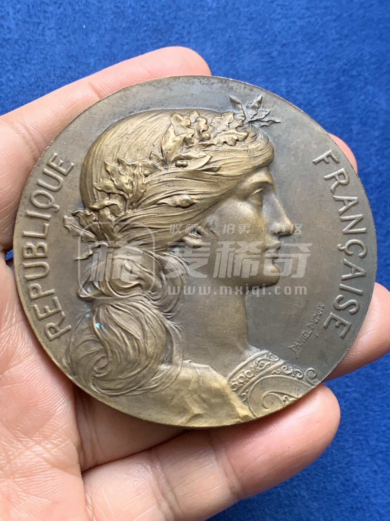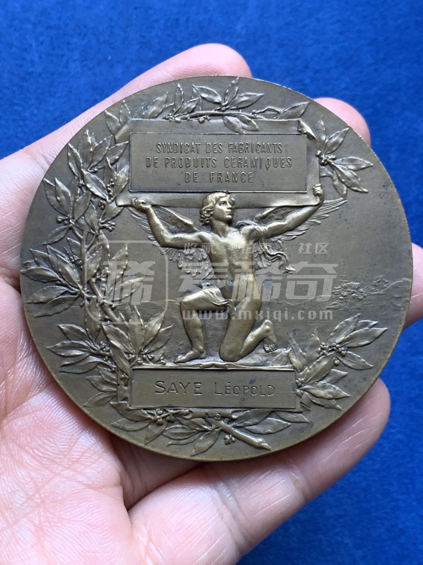 法国陶瓷制品制造商工会颁发的铜质荣誉纪念章。正面为戴橡叶冠的法兰西共和国玛丽安娜女神像,环刻“法兰西共和国”;背面以跪姿带翼天使托举铭牌为主体,刻有工会名与受赠者SAYE LÉOPOLD,配月桂叶纹饰。