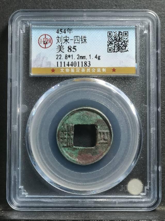 南北朝•南朝刘宋四铢 公博评级美85分 数据 22.8*1.2mm,1.4g 查档编号 1114401183 红绿薄锈,难得生坑品相,铸字工整,字口高耸清晰,历经一千六百年的时间长河依然隽永。 tips 这枚南朝“四铢”是南朝宋文帝刘义隆在元嘉七年铸造,也是南朝第一种官方货币,铸造时间极短,很快就被孝建四铢所取代。值得一提的是,刘宋的版图面积还大于赵宋。 此钱存世量较少,对研究南朝货币政策和冶金技术很有价值。