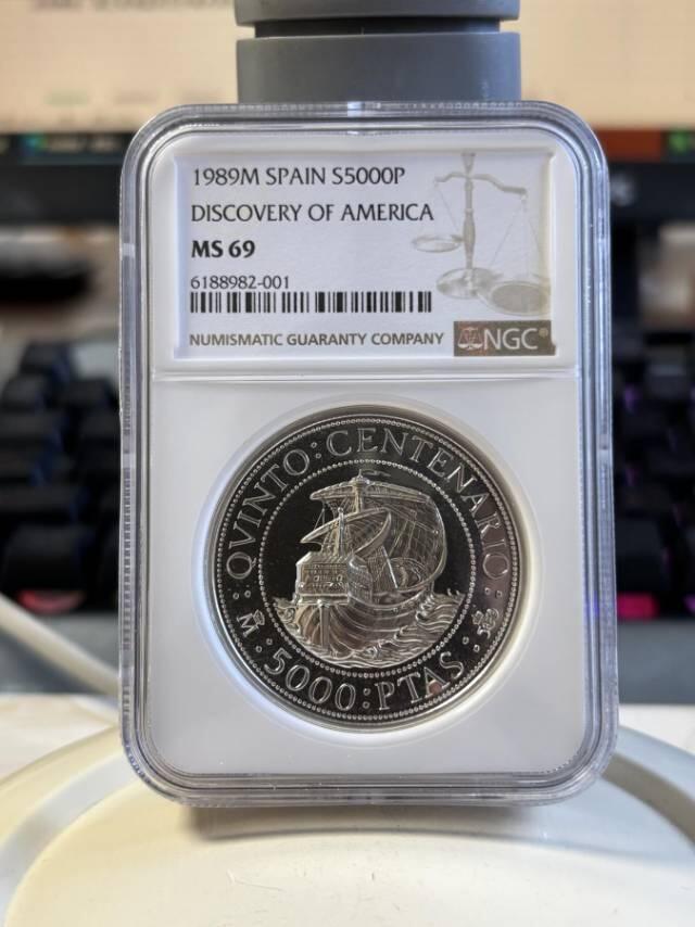 西班牙1989年5000比塞塔「发现美洲500周年」 纪念银币 (NGC MS69)详解 这是西班牙皇家造币厂发行的发现美洲500周年系列纪念银币,经国际顶级钱币评级机构NGC评级为MS69(Mint State 69,未流通次高分),同时是享誉全球的克劳斯世界硬币大奖(Krause Coin of the Year Awards)获奖币,是西班牙大航海主题的标杆级收藏币。