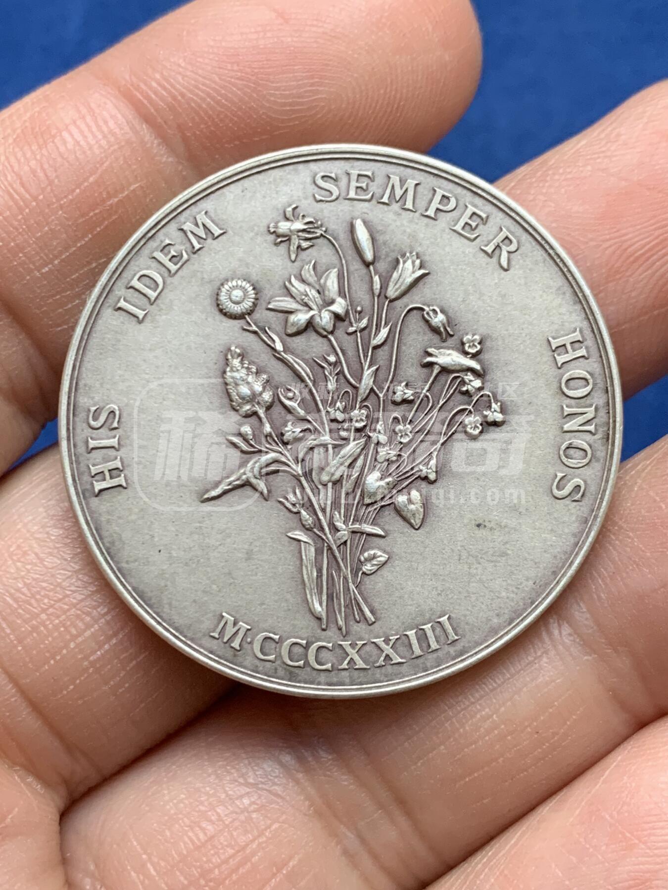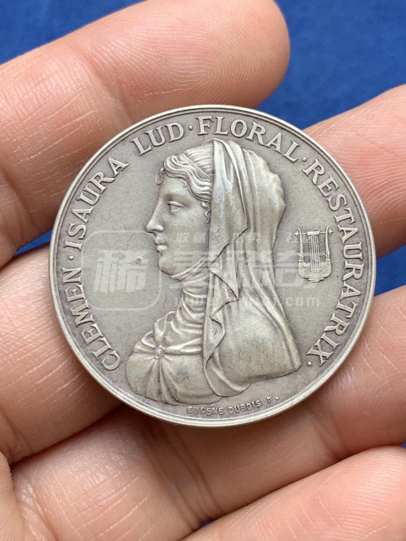 这枚法国银章由雕刻家欧仁·迪布瓦打造,纪念图卢兹“花之游戏”的复兴者克莱芒丝·伊索尔。正面镌其戴纱巾的优雅侧像,旁饰里拉琴,彰显其诗人身份;背面以1323年花会为纪年,刻满象征诗意的花束,铭文寓意“荣光恒在,初心不改”。