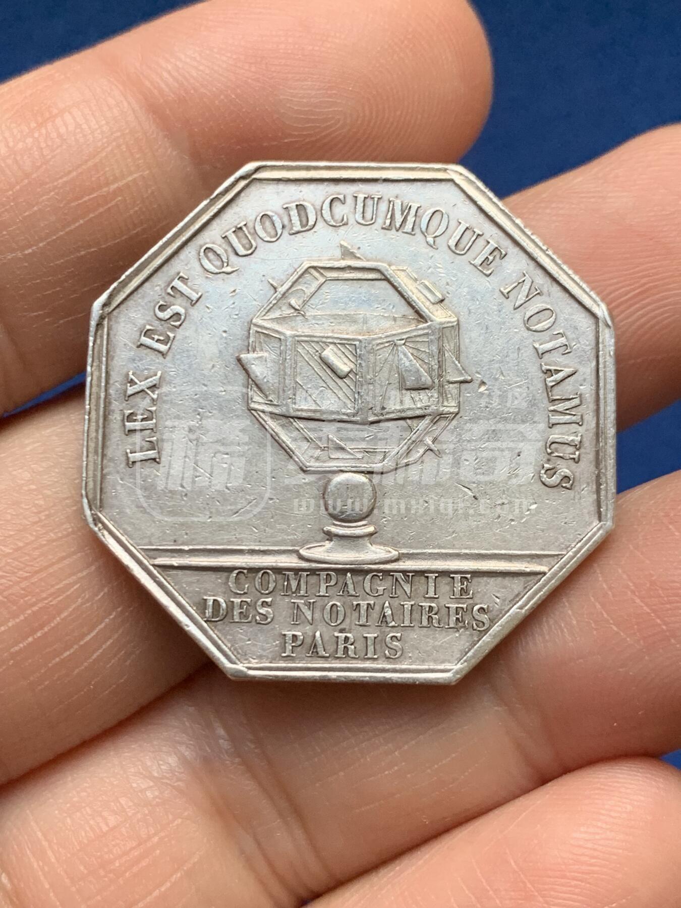 法国路易·菲利普一世时期巴黎公证人公司八角银章。正面镌国王路易·菲利普一世侧面像,彰显时代背景;背面以公证人标志性的八角印台为核心,铭文“法律所及,皆为公证”点明职业精神。