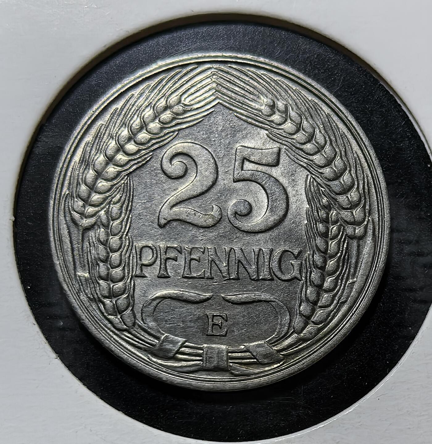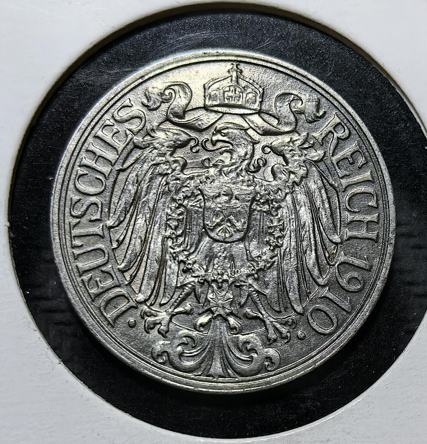 德意志第二帝国1910年25 芬尼镍币,E 厂标代表穆尔德海姆造币厂,正面为帝国鹰徽,背面麦穗环绕面值,是一战前德国金马克体系下的法定流通辅币。