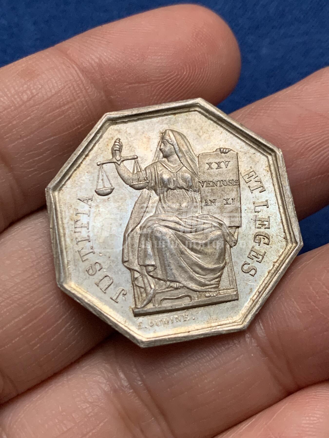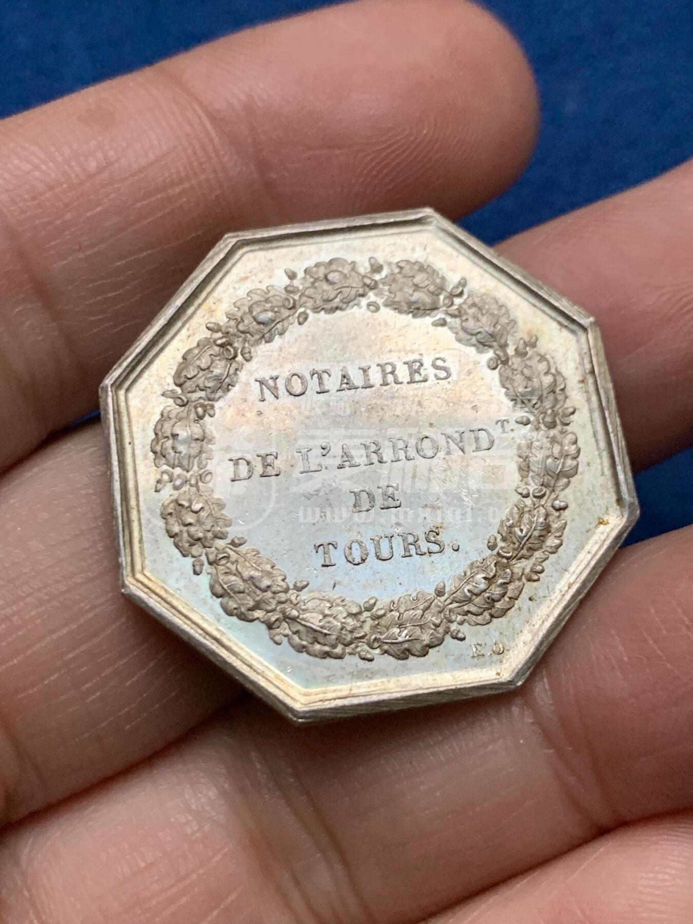 法国图尔省公证人协会发行的八角银质代用章。正面为持天平、握法典的正义女神坐像,铭文“正义与法律”标注《拿破仑法典》颁布日期(共和11年风月25日,1803年);背面以橡叶环环绕“图尔省公证人”字样。