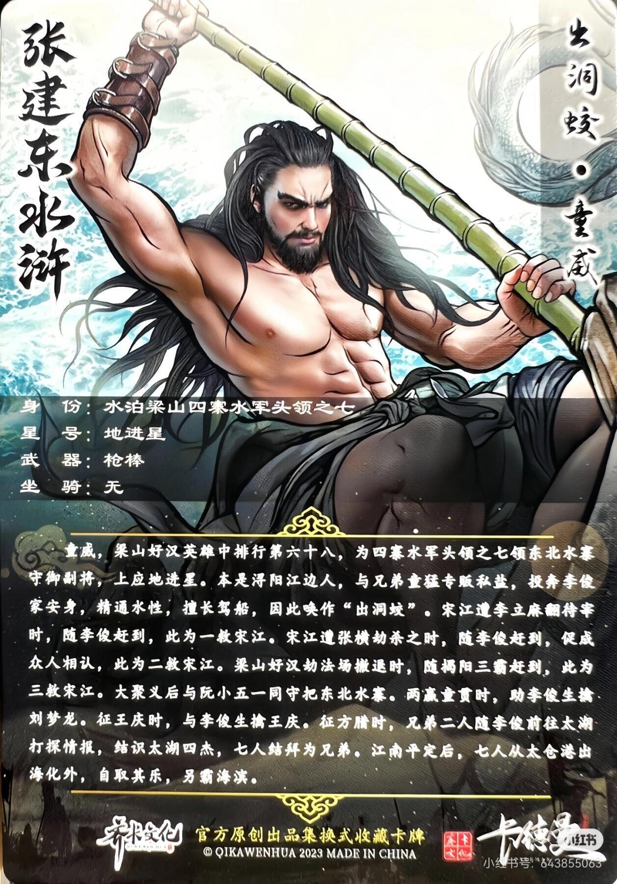 童威,梁山好汉英雄中排行第六十八,为四寨水军头领之七领东北水寨守御副将,上应地进星。本是浔阳江边人,与兄弟童猛专贩私盐,投奔李俊家安身,精通水性,擅长驾船,因此唤作“出洞蛟”。宋江遭李立麻翻待宰时,随李俊赶到,此为一救宋江。宋江遭张横劫杀之时,随李俊赶到,促成众人相认,此为二救宋江。梁山好汉劫法场撤退时,随揭阳三霸赶到,此为三救宋江。大聚义后与阮小五一同守把东北水寨。两赢童贯时,助李俊生擒刘梦龙。征王庆时,与李俊生擒王庆。征方腊时,兄弟二人随李俊前往太湖打探情报,结识太湖四杰,七人结拜为兄弟。江南平定后,七人从太仓港出海化外,自取其乐,另霸海滨。