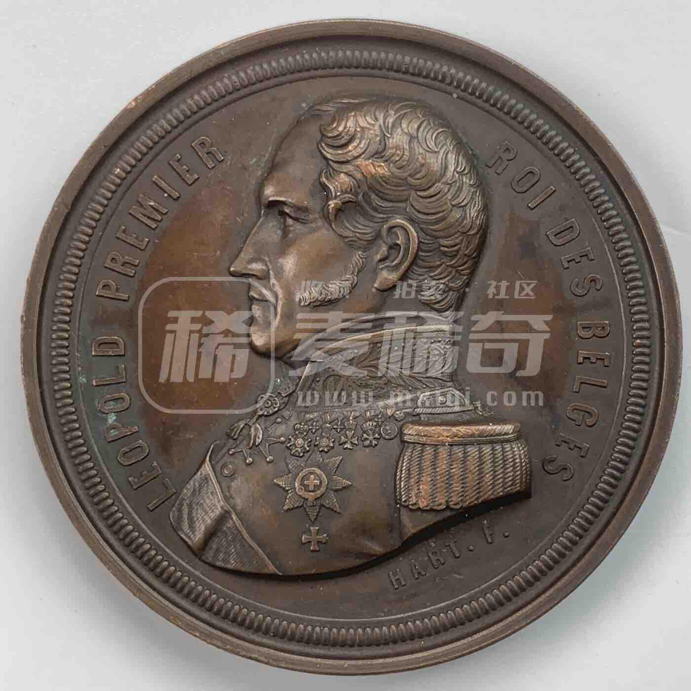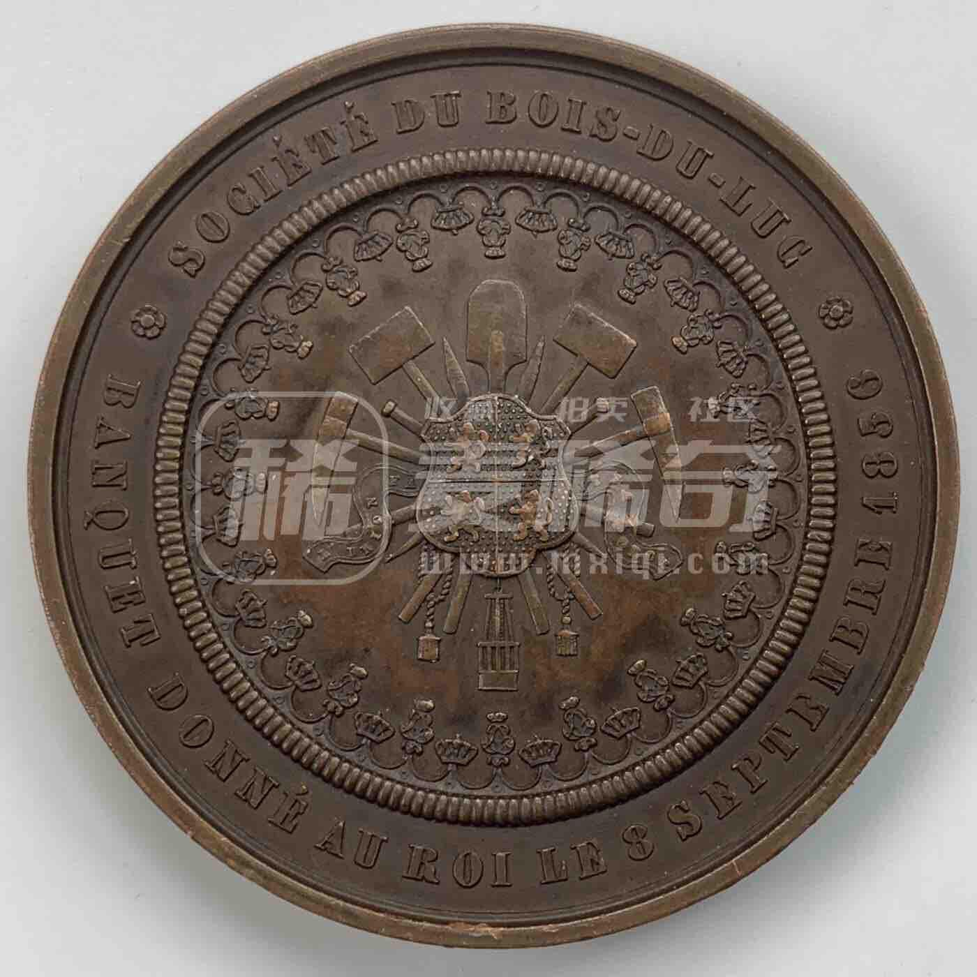 1856年比利时利奥波德一世铜质纪念章,正面为身着军装、佩戴勋章的利奥波德一世侧面像;背面以工具、纹章为核心图案,记录了1856年比利时Bois-du-Luc协会为国王举办的宴会事件。