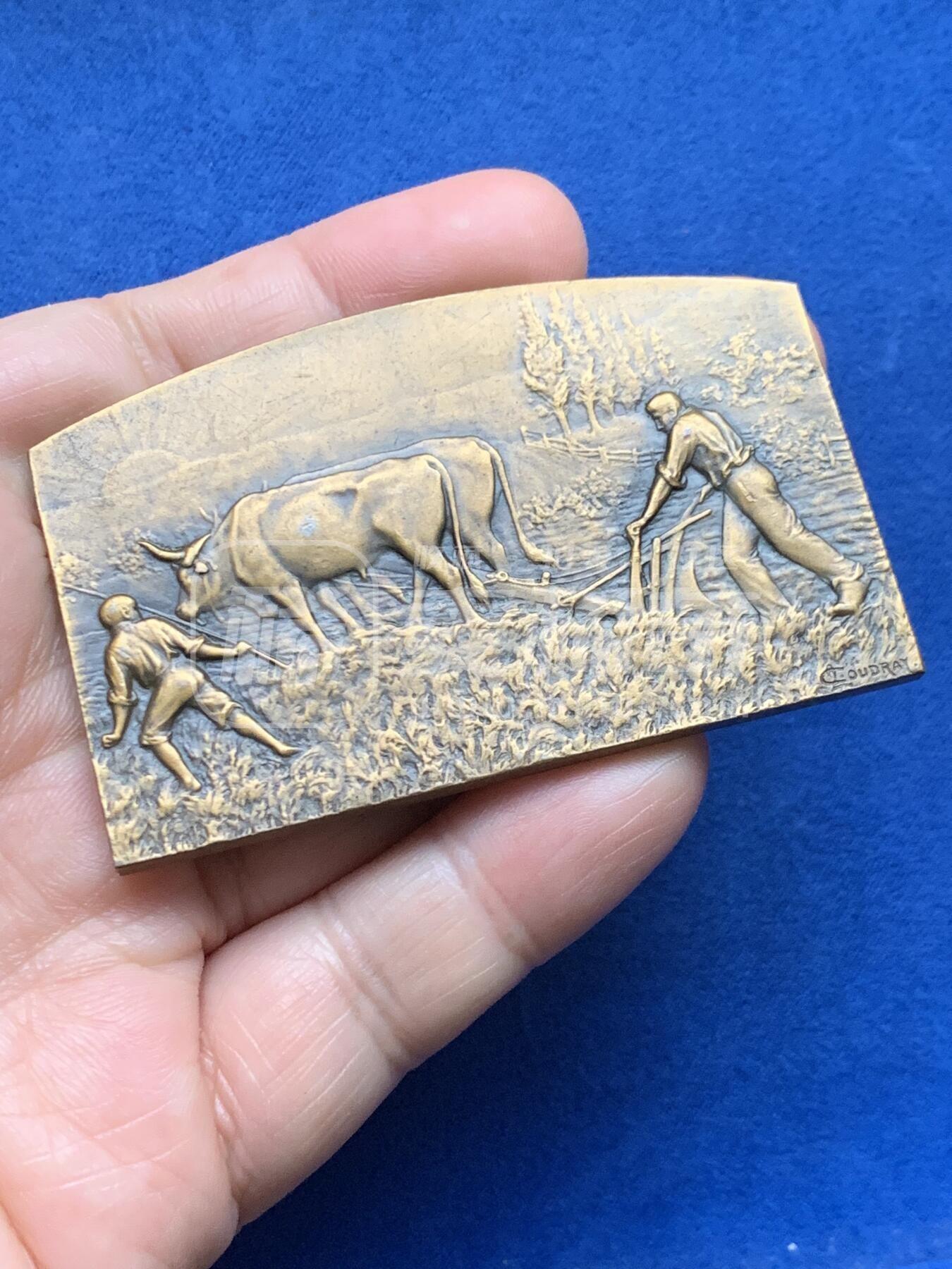 法国南部地区农业储蓄银行异形铜章,扇形形制,正面浮雕牛耕场景,细节写实;背面刻镰刀收割场景及“CAISSE RÉGIONALE DU MIDI”字样,记录法国南部农业风貌与金融机构历史。