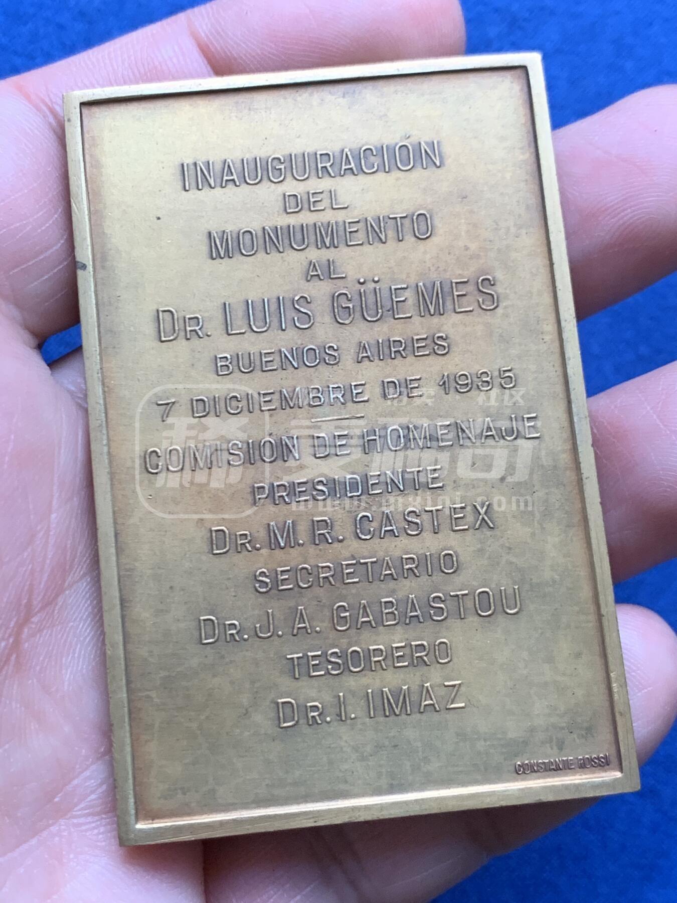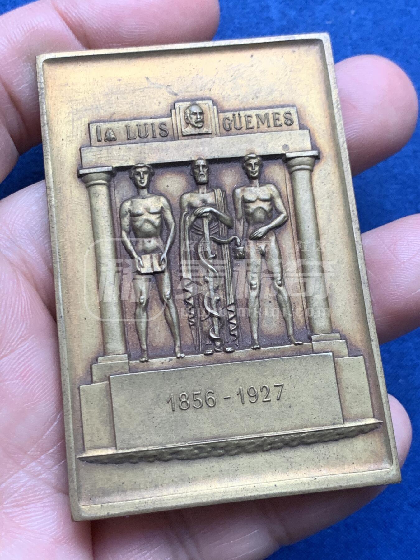 1935年阿根廷纪念路易斯·古埃梅斯博士的纪念铜章,正面刻画立柱间的三尊人像,中间为持蛇杖的医神形象,上方标注人物名与生卒年份1856-1927;背面为西班牙语铭文,记载布宜诺斯艾利斯纪念碑落成仪式信息。