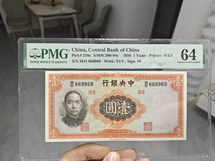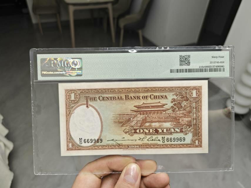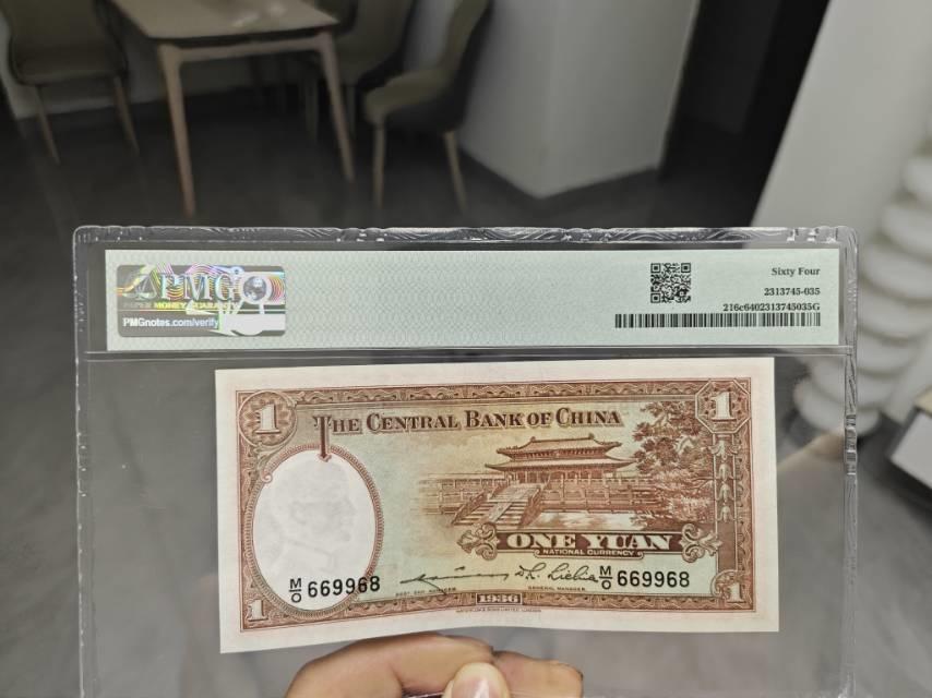 民国二十五年中央银行壹圆,刀拆品质 PMG64 两连倒置号,极其难遇,号码极品。 800包邮
