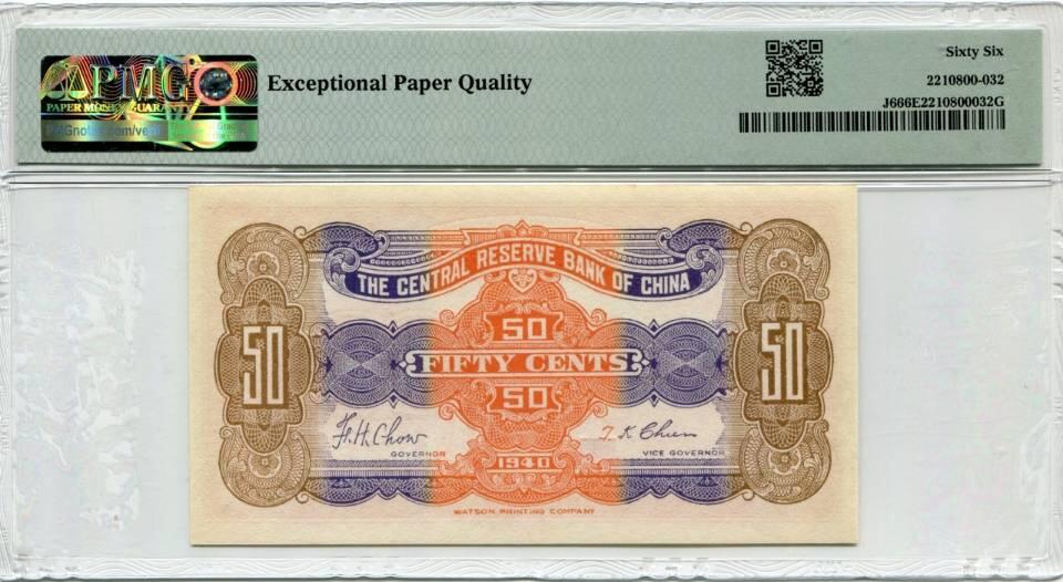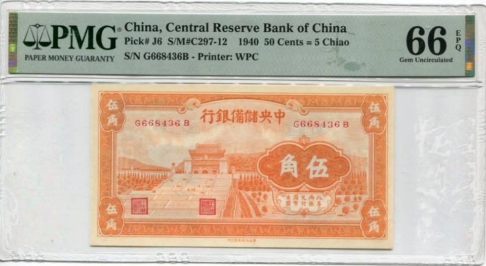 民国29年中央储备银行黄伍角,PMG66EPQ,稀少橙色版别伍角,超强凹凸感,状态一流,背面三色经典设计,设计精美,高分难得,季军分,亚军12,冠军1 800 包邮