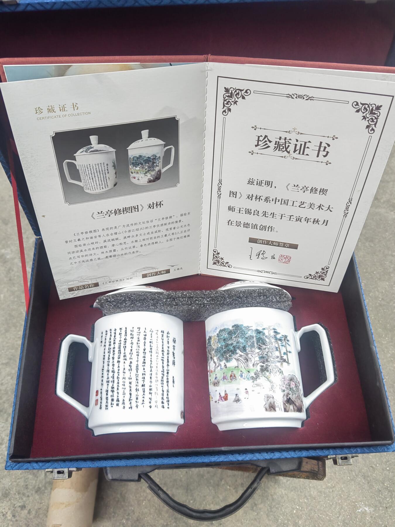 王锡良的兰亭修楔图对杯,王锡良是现在陶瓷界大师,他的兰亭序瓷版画更拍出4百多万的价格,老师已经离世一周年了,他的作品更是一件难求