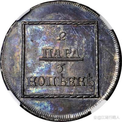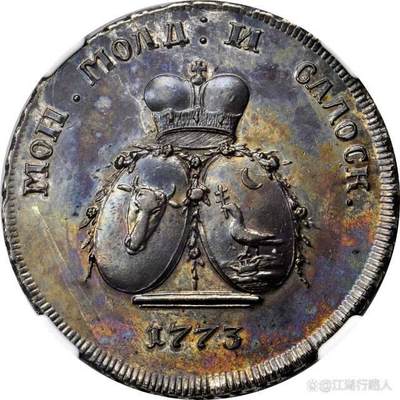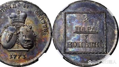 俄罗斯帝国-摩尔达维亚和瓦拉几亚联合发行的银质样币! 1773年叶卡捷琳娜二世统治时期,由贵族彼得·加滕贝格的庄园铸造)。正面为摩尔达维亚和瓦拉几亚的联合纹章(戴冠双鹰),周围环绕玫瑰花环,背面为双重面值Para为摩尔达维亚货币单位,Kopek为俄罗斯货币单位。 18世纪,摩尔达维亚和瓦拉几亚是奥斯曼帝国的附属公国,后被俄罗斯控制。 这枚俄罗斯-摩尔达维亚和瓦拉几亚银质样币是欧洲钱币收藏中的顶级珍品