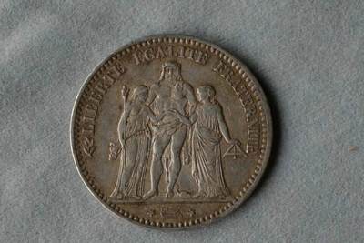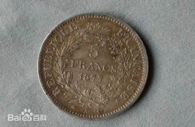 法国大力神银币是法国自18世纪末至20世纪中后期发行的法定货币,含银量达90%,最初于法国大革命期间(1798-1799年)作为5法郎银币问世,后延续至法兰西第二共和国、第三共和国及第五共和国时期。该系列银币在第五共和国时期调整为10法郎(25克)和50法郎(30克)两种规格[3][4]。 银币正面以希腊神话大力神赫拉克勒斯为中心,两侧分立手持自由杆的智慧女神雅典娜与持天平的正义女神忒弥斯,上方铸有法文"自由、平等、博爱"口号[1][3][4]。背面印有"法兰西共和国"字样及象征和平的橄榄枝与橡树枝,不同版别通过铸币厂标记(如A、K、B等)及发行年份区分[2][3][4]。主要发行阶段包括第二共和国(1848-1849年)、第三共和国(1870-1878年、1889年)发行的5法郎银币,以及第五共和国1965-1973年发行的10法郎和1974-1980年发行的50法郎银币[3][4]。