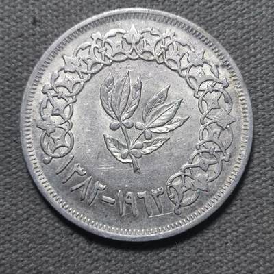 这是一枚1963年(伊斯兰历1382年)阿拉伯也门共和国1里亚尔银币,以下是详细介绍: 一、基本信息 - 发行国:阿拉伯也门共和国(北也门,1962–1990) - 面值:1里亚尔(Riyal) - 年份:公元1963年,对应伊斯兰历1382年(AH 1382) - 材质与重量:含银量72%,重约19.75克 - 铸造量:约4,614,000枚 二、币面设计 - 正面(图一): - 中央为阿拉伯文“الله محمد رسول”(意为“真主,穆罕默德是使者”),被圆圈环绕。 - 外圈阿拉伯文为“جمهورية العربية اليمنية”,即“阿拉伯也门共和国”。 - 边缘有装饰性花纹与齿边。 - 背面(图二): - 中央是带有八片叶子的咖啡树枝图案,象征也门的重要经济作物。 - 底部阿拉伯文标注年份“١٣٨٢ - ١٩٦٣”,即伊斯兰历1382年,对应公历1963年。 - 外圈为连续的星形花纹装饰。 三、收藏与价值 - 这是也门共和国成立后发行的首套流通银币之一,具有一定的历史意义。 - 目前在收藏市场上,流通好品的价格通常在数百元人民币左右,未流通或评级币的价格会更高。