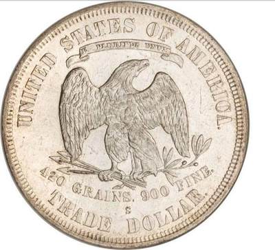 美国贸易银币(Trade Dollar)俗称“拿花”,是清朝后期流通的标准贸易银币品种。该银币由美国于1873年发行,旨在争夺远东贸易市场,商用币铸造持续至1878年,精制版限量发行到1883年。其含银量为90%,重量27.22克,边缘标注“420格林,900纯度”参数。银元正面为持橄榄枝的自由女神坐像,镌刻“LIBERTY”及“INGODWETRUST”铭文;背面为昂首张翅立鹰图案,配有“EPLURIBUS UNUM”字样[2],由国家造币厂、旧金山造币厂(标记S)和卡森城造币厂(标记CC)三家机构铸造[1]。 1873年首批银元通过贸易输入中国,清政府经化验后准许其作为税款支付并进入流通。铸造全程至1885年结束,1887年7月美国政府下令回收流通中的贸易银元。该币种因自由女神右手橄榄枝形似花朵,在中国民间得名“拿花”[2]。