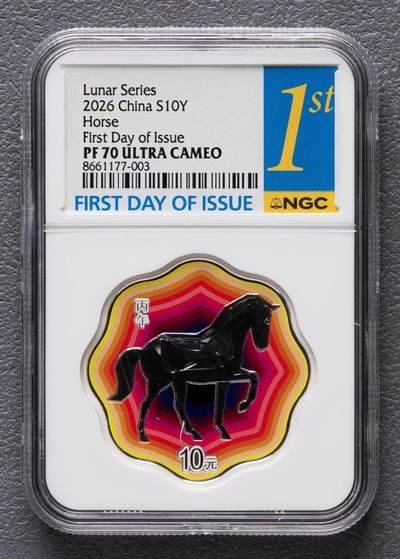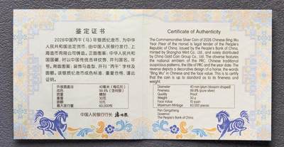 1. 材质成色:99.9%纯银30克,精制币; 2. 规格面额:外接圆直径40毫米,面额10元; 3. 发行量:最大发行量60000枚; 4. 正面:国徽+传统吉祥纹饰,刊国名、2026年号; 5. 背面:钻石切割风装饰马,彩色渐变背景,刊“丙午”及面额; 6. 设计/雕刻/铸造:侯继强设计、黄喆雕刻,上海造币有限公司铸造;
