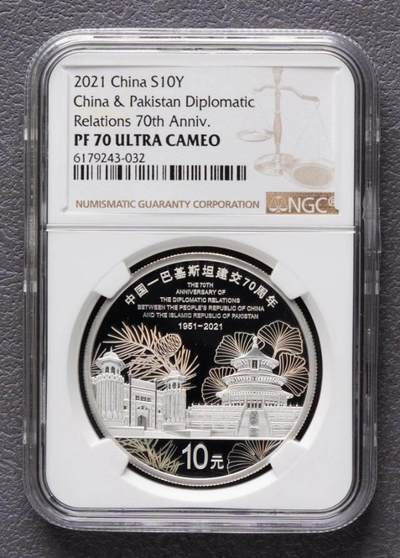 央行2021年9月16日发行的中国-巴基斯坦建交70周年30克圆形银质纪念币(属一套2枚金银币中的银币),为中华人民共和国法定货币 。 核心参数 1. 材质成色:纯银30克,成色99.9%,精制币 ; 2. 规格面额:直径40毫米,面额10元 ; 3. 发行量:最大发行量10000枚 ; 4. 正面:国徽,刊国名、年号(2021) ; 5. 背面:天坛祈年殿、拉合尔古堡,衬银杏与喜马拉雅雪松枝叶,刊主题中英文、“1951-2021”及面额