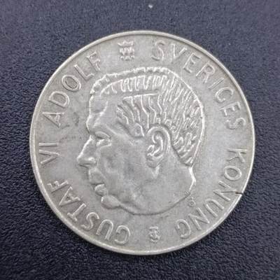 中央是瑞典国王**古斯塔夫六世·阿道夫(Gustaf VI Adolf)**的左侧面头像,环绕文字为 GUSTAF VI ADOLF SVERIGES KONUNG(瑞典国王古斯塔夫六世·阿道夫),下方有造币厂标记。
