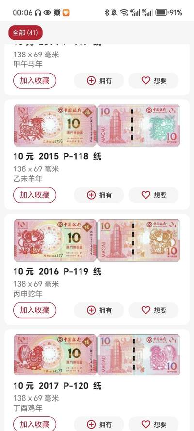 这是澳门中国银行发行的10元生肖纪念钞与流通钞,从龙年到鸡年等生肖主题鲜明,尺寸规整,兼具流通与收藏价值,是澳门货币文化的生动载体。 要不要我帮你整理一份澳门10元生肖钞完整年份与对应生肖清单,方便你对照收藏?