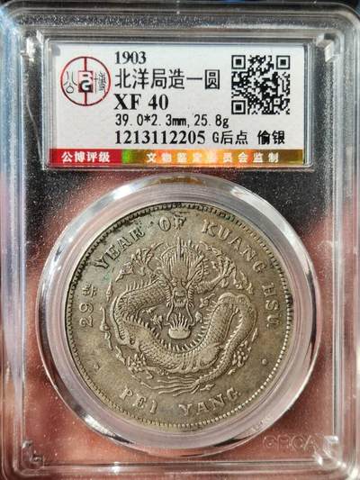 公博XF40,1903年北洋局造一圆,G后点偷银版,29年北洋龙稀有版别。原味醇厚包浆,龙鳞立体饱满,字口清晰深打,底板状态佳。麦稀奇平台同版同分数近期成交价约5800-7100元,此枚状态一流,北洋29年光绪元宝,公博XF40,G后点偷银版,稀有版别。