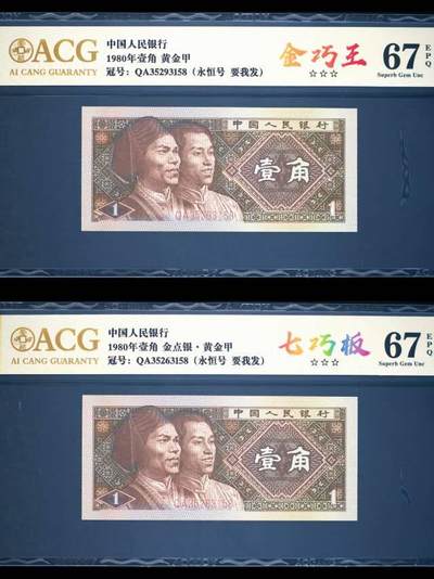 一眼清币王级藏品QA3529之O版金巧王1张。本品消耗沉淀已达9年之久,O版金巧王属金巧王的细分品种,集底纹O版、金口1、万位9最强七巧王于一体,杠体强大效果绝佳,票面宏观霸气,视觉超级震撼,王相锋芒毕露,一眼清之王实至名归其视觉效果达到顶峰!本品老精稀珍奇于一身,属第四版人民币的艺术精华再现,而且集工艺性、珍稀性、鉴赏性、增值性于一体,更有票面印制的艺术美、一眼清的直观美、荧光下的鉴赏美。本品属题材币高端藏品,增值与投资回报率超高的理想品种,实力藏家作为“看家宝”的珍品之选,具有竞争币王资质的一眼清超级珍品!