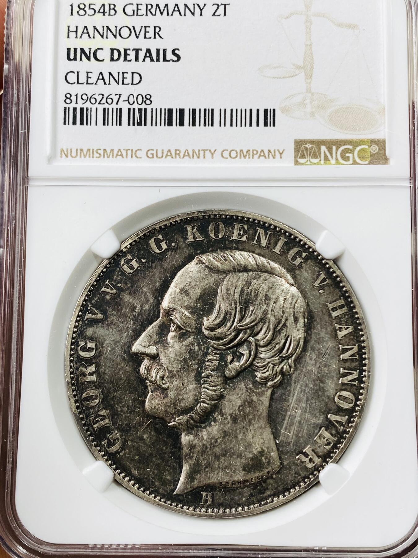 NGC UNCD 1854年德国汉诺威狮马盾徽2泰勒 狮马2t首年版本 黑包浆 背面狮马盾徽浮雕感与喷砂感极强