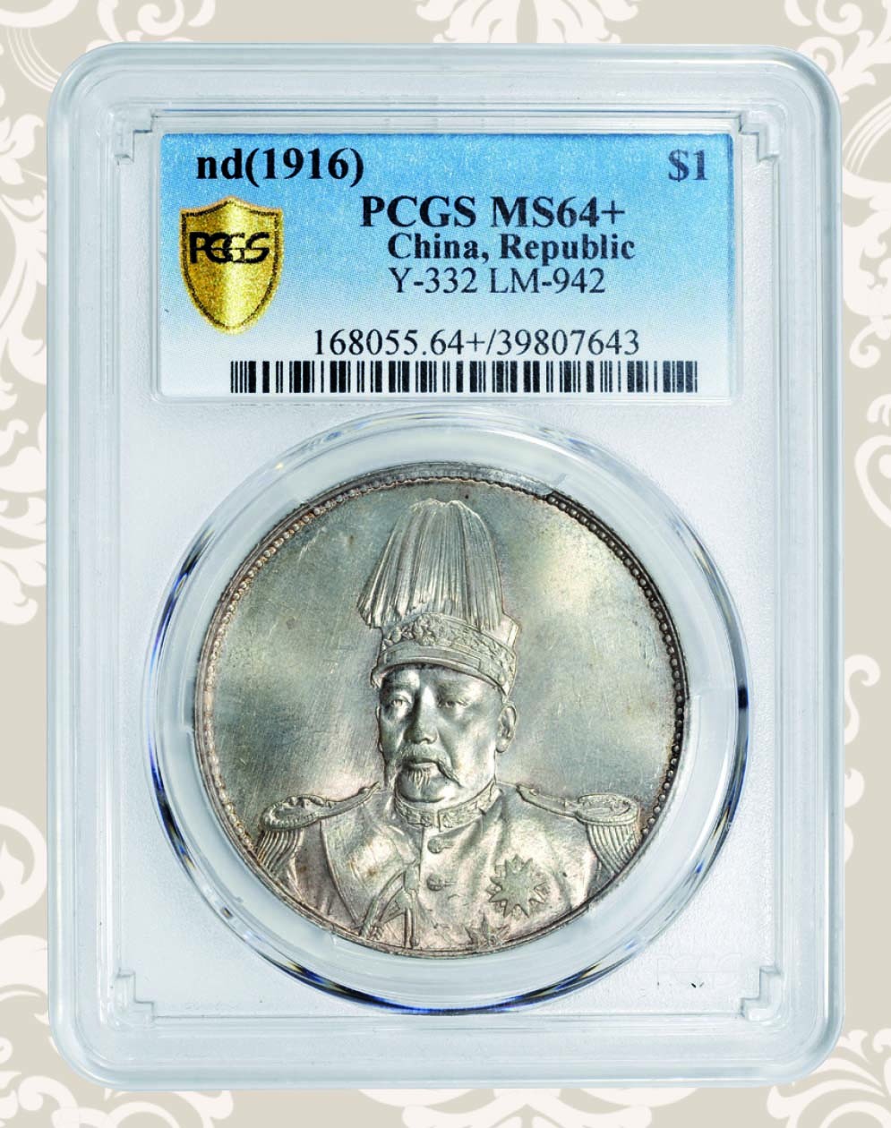 PCGS MS64+编号:39807643纪念袁世凯登基为洪宪帝。铸打深峻有力细节纤毫毕现品相极佳定能引来藏家一掷千金。